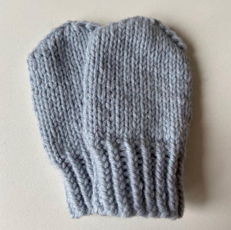 Hand knitted with lovely and soft Rico baby classic DK yarn which is ideal for precious new born skin. These are thumbless so no need to wrestle with tiny hands, the wrist band is also in stretchy fisherman's rib which keeps its shape well.