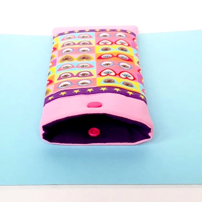 The front of the padded pouch is patchwork featuring our own design Spoonflower fabrics Mini Specs, Stars Forever and a plain pink cotton. The back is plain pink cotton, the lining is purple cotton and there is a pink snap closure to keep glasses secure inside.