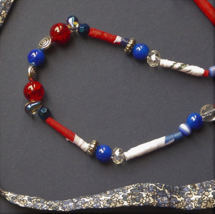 Hand made textile beads are mixed with a generous arrangement of glass/metal and acrylic beads to add just a little sparkle. This light to wear necklace is so comfortable with a soft fabric neckband eliminating tricky fastenings. Colours of red white blue and gold make this suitable for regal or even seaside occasions.