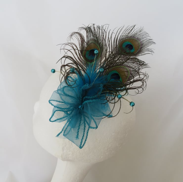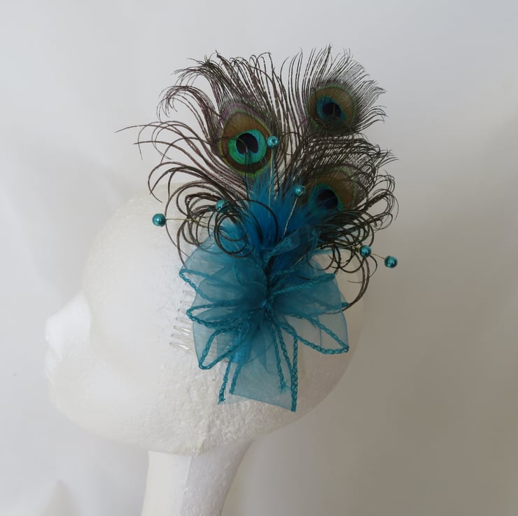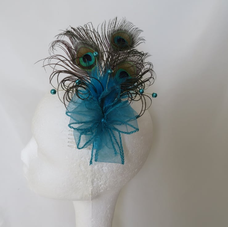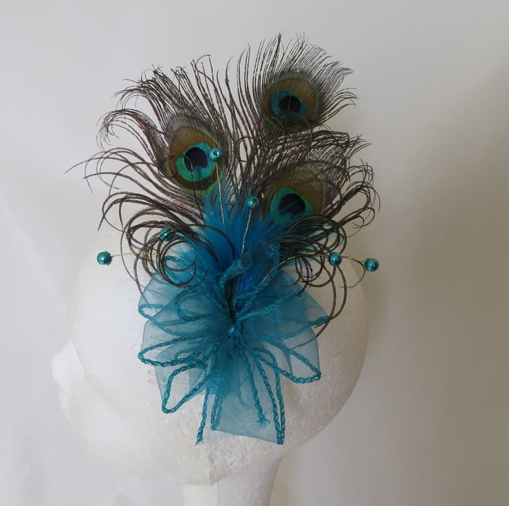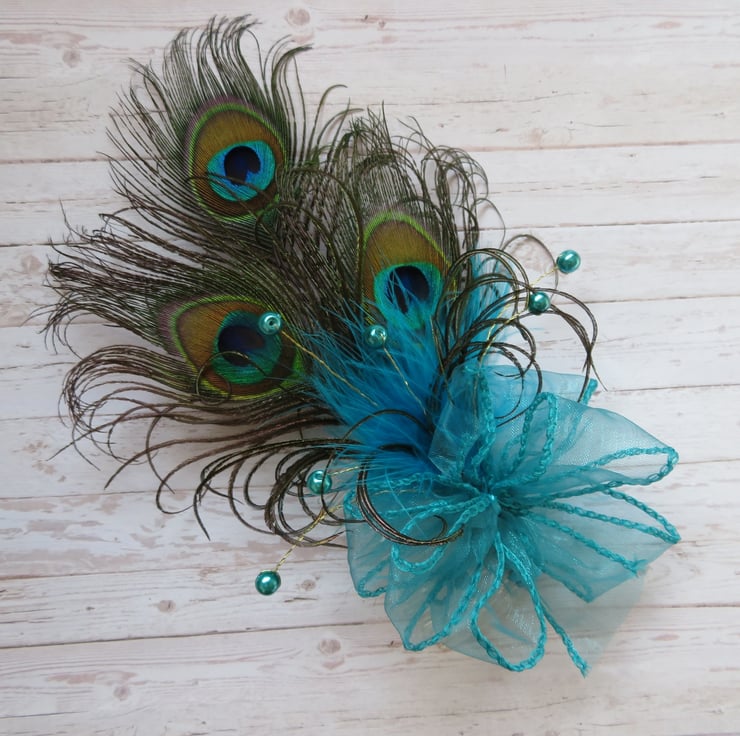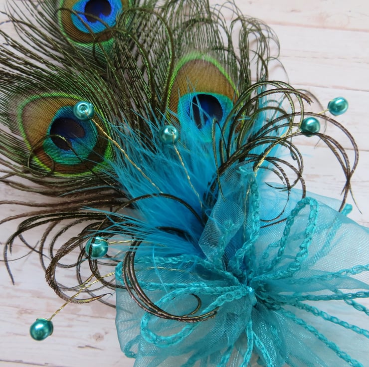 Created with three small beautiful peacock eye feathers, dark turquoise fluff feathers and finished with teal pearls on gold wire stems and a large teal organza bow.