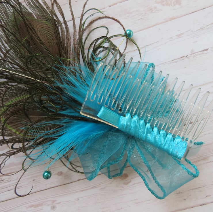 Attached onto a small clear plastic comb with dark turquoise satin ribbon bound over the end, with a small loop of ribbon for pushing a hair grip through for extra anchorage when fixing in hair.
