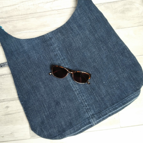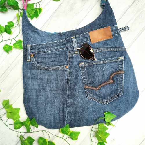 Upcycled with a pretty but grungy feel. Pre-loved denim jeans make this casual shoulder or cross body bag a fabulous everyday bag.