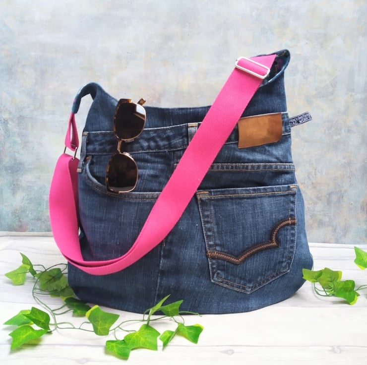 The front of the bag has two, usable jeans pockets and added leather patch replicates the label from the original jeans - the vibrant pink adjustable cross body strap contrasts perfectly with the colour of the lining.