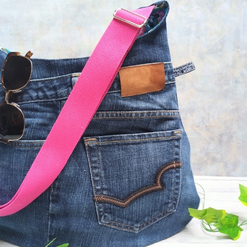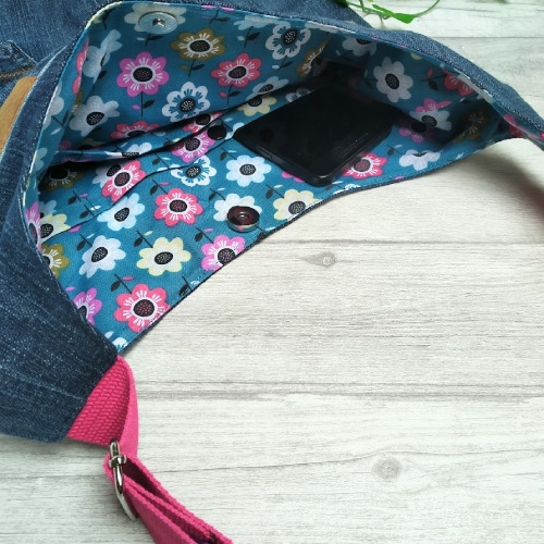 With a 'lived-in' feel, the vibrant pink strap and a flowered lining in blues and pinks that works beautifully with the recycled denim.