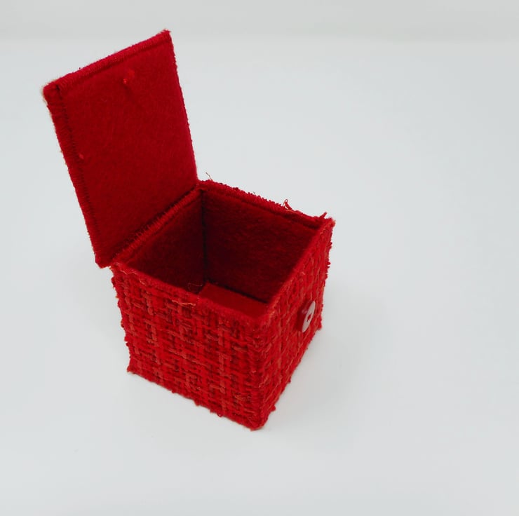 The box is lined in a red wool felt, and it fastens with a loop of red thread and a recycled red plastic button.