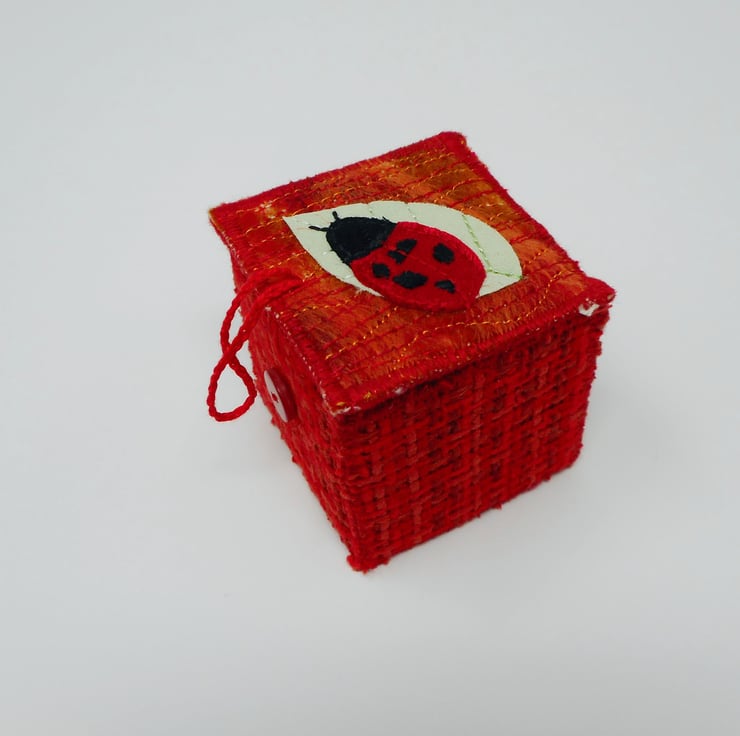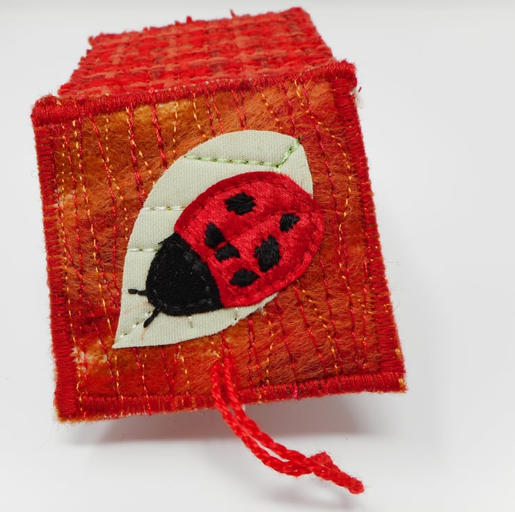 The top is made from a piece of handmade felt that has been machine embroidered. A leaf and ladybird has then been appliqued on top, with the ladybird details then hand embroidered.