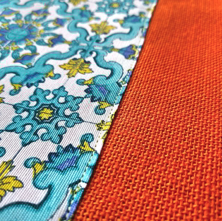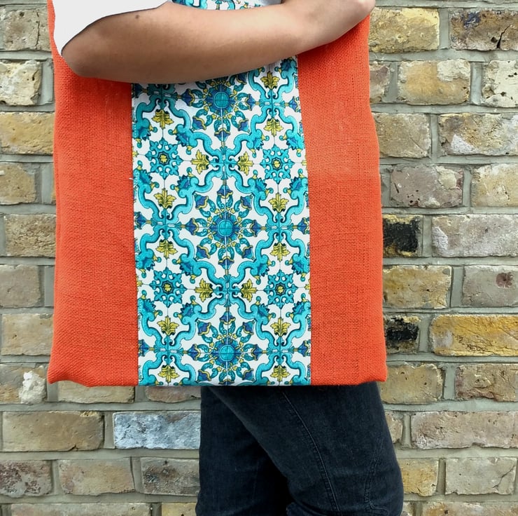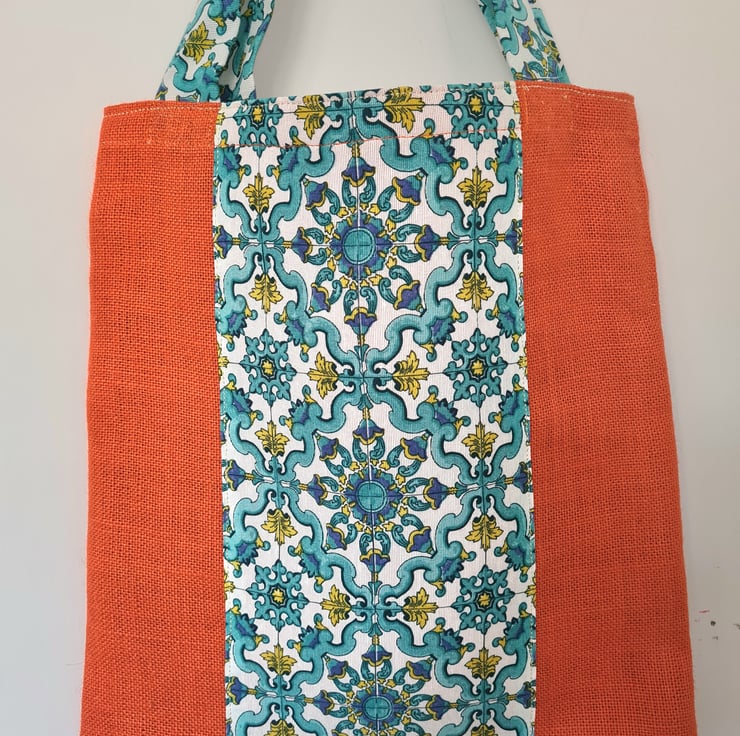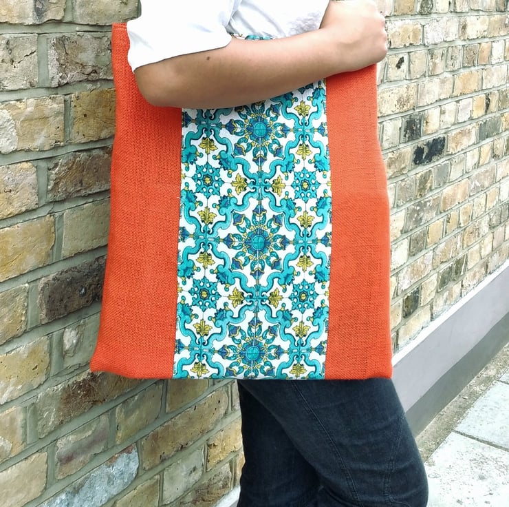 Handmade tote bag, made with orange hessian and Italian unique fabric.