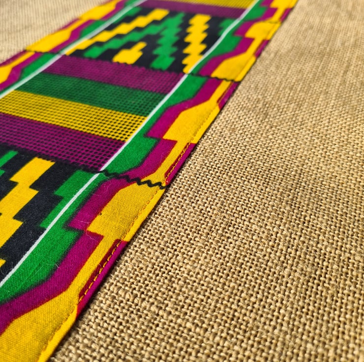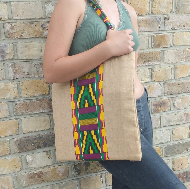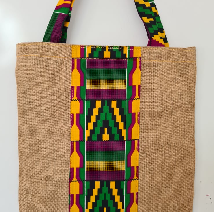 Handmade shopping bag made with natural hessian and African printed fabric.