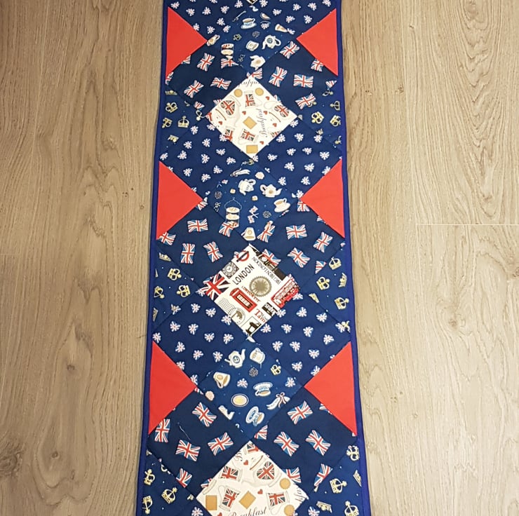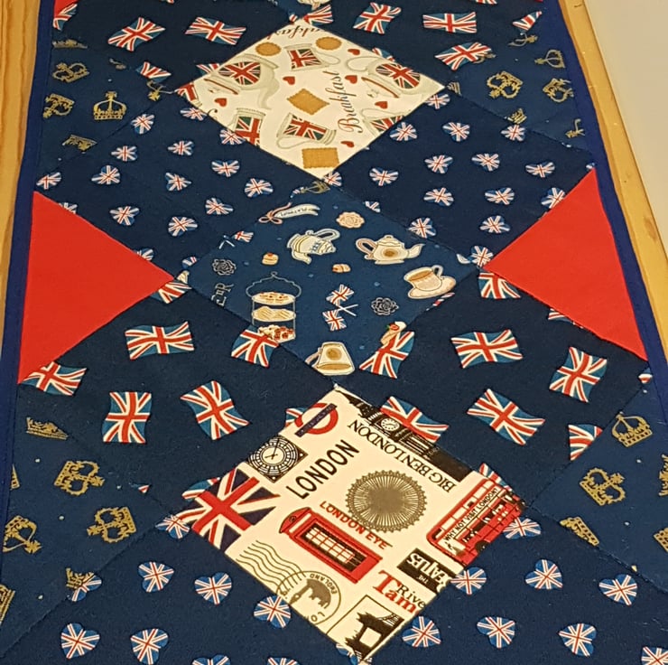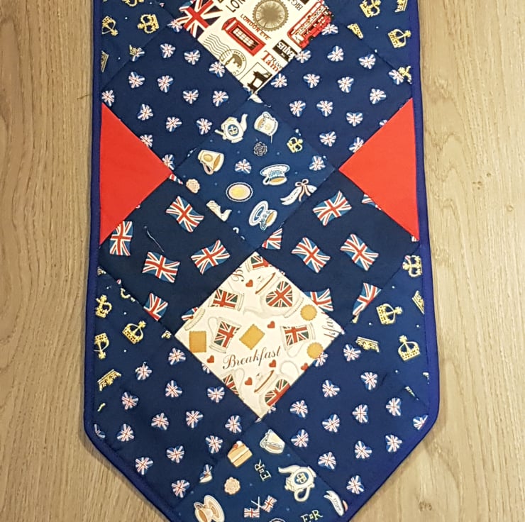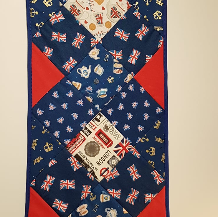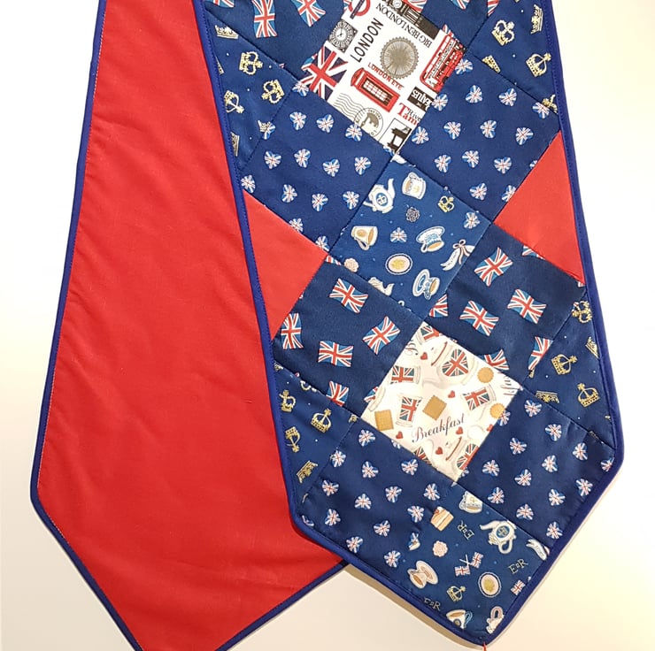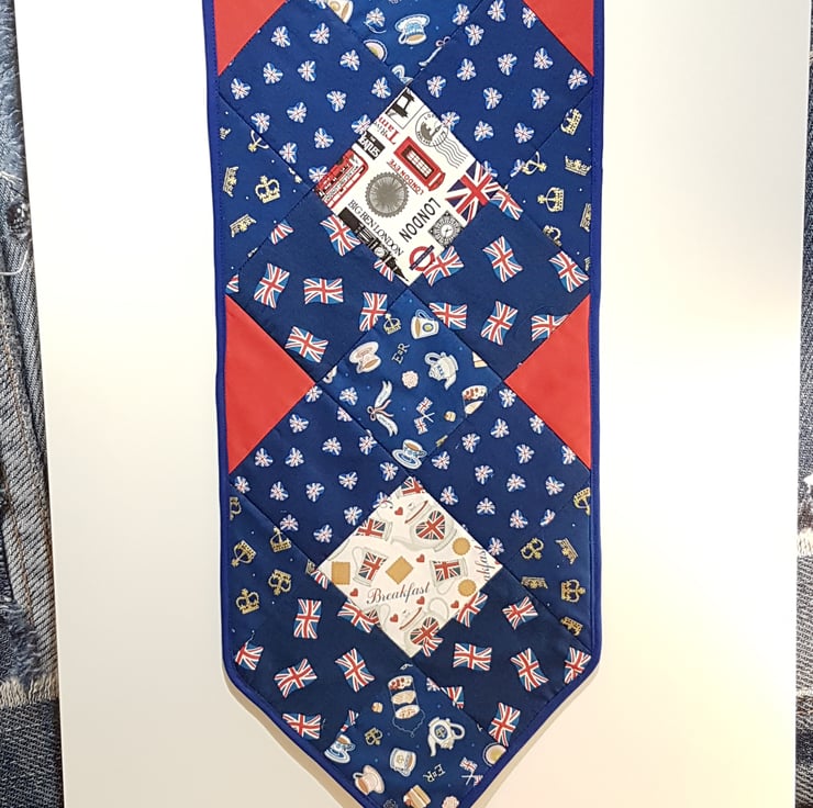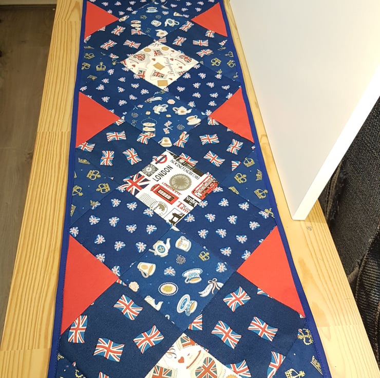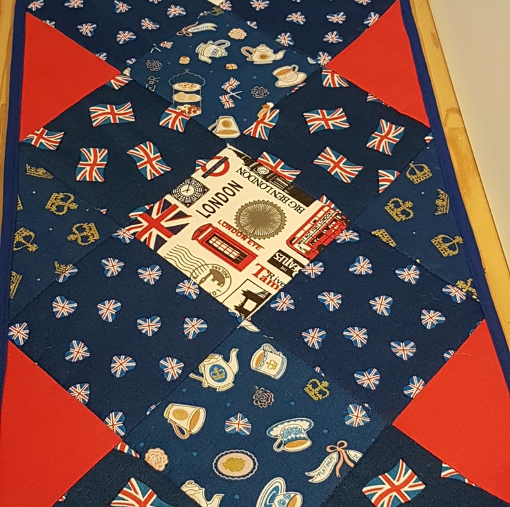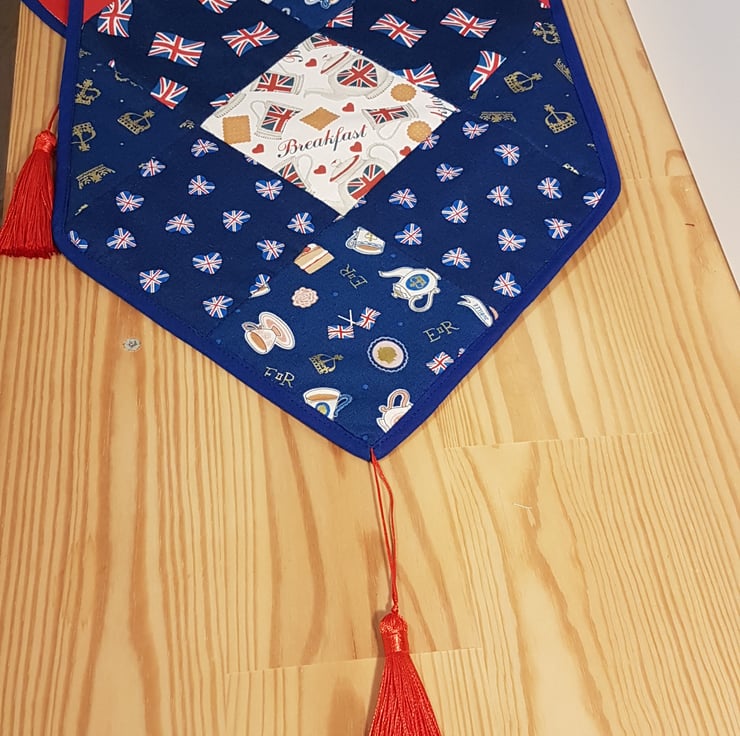 Very long patchwork table runner for celebration the King's coronation. Perfect for center piece on your coronation party table. The patterns are Union Jack flags ,hearts,crowns,teapots,biscuits etc. in English colors. Both end of the table runner has red tassels. This is a really long table runner, the both end hanging down from a normal size dining table. Size: 160cm long and 29cm wide plus the tassels. The tassel are 8cm plus 7cm strings.