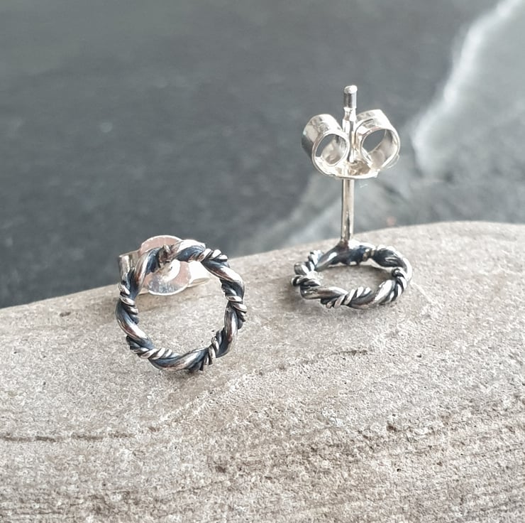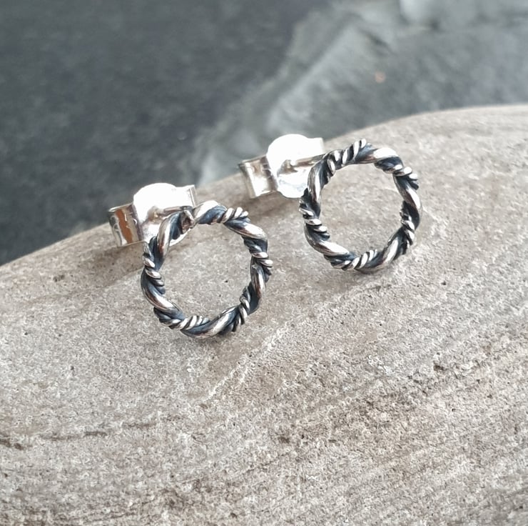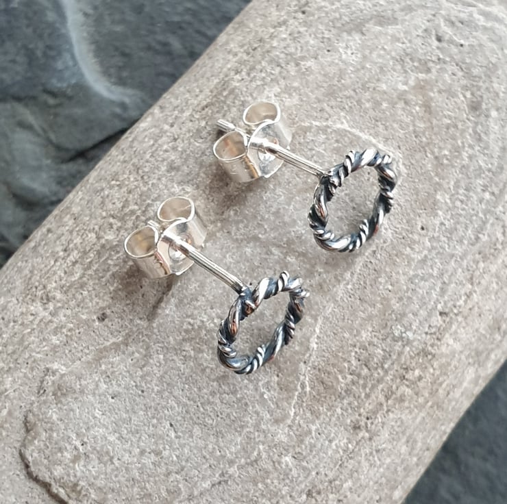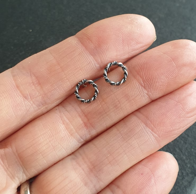 Dainty small circle studs made from a twisted sterling silver wire with stud posts and butterfly backs. I've oxidised the silver and buffed them for an antique, aged appearance.