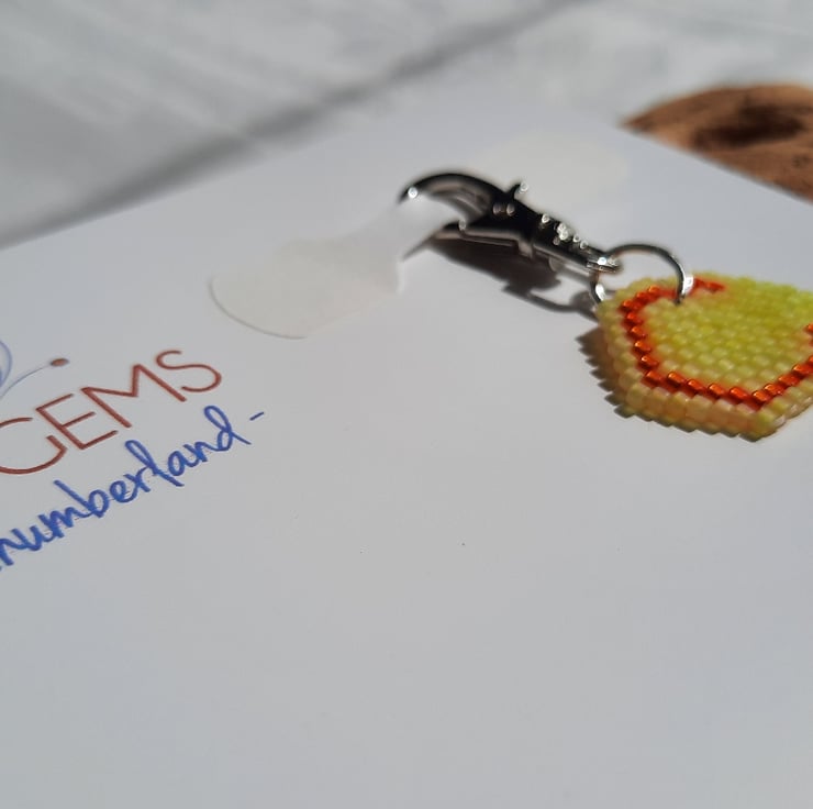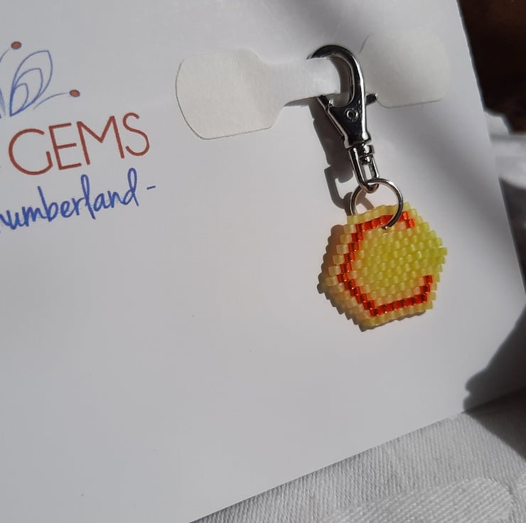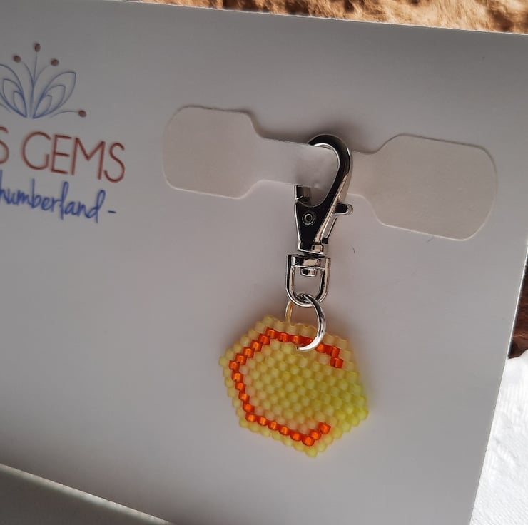 A light weight beaded charm using Japanese Delica beads. The background is in a frosted transparent yellow with a silver lined orange for the letter C itself. It has a drop of approx. 2cm from the base of the keyring and it's approx. 2.3cm wide. The keyring and jump ring are a silver tone colour.
