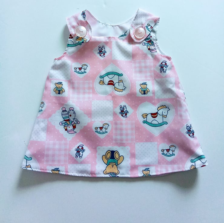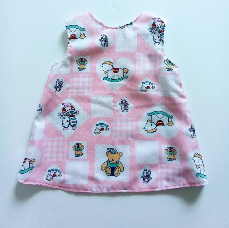 A line style summer dress/pinafore with Teddy Bears, Clowns and Rocking Horses. It is fully lined.