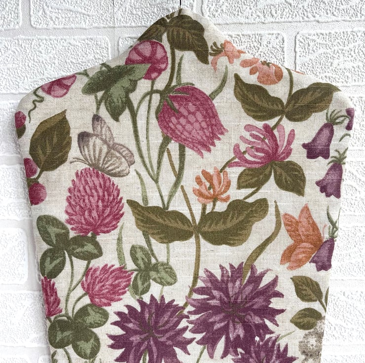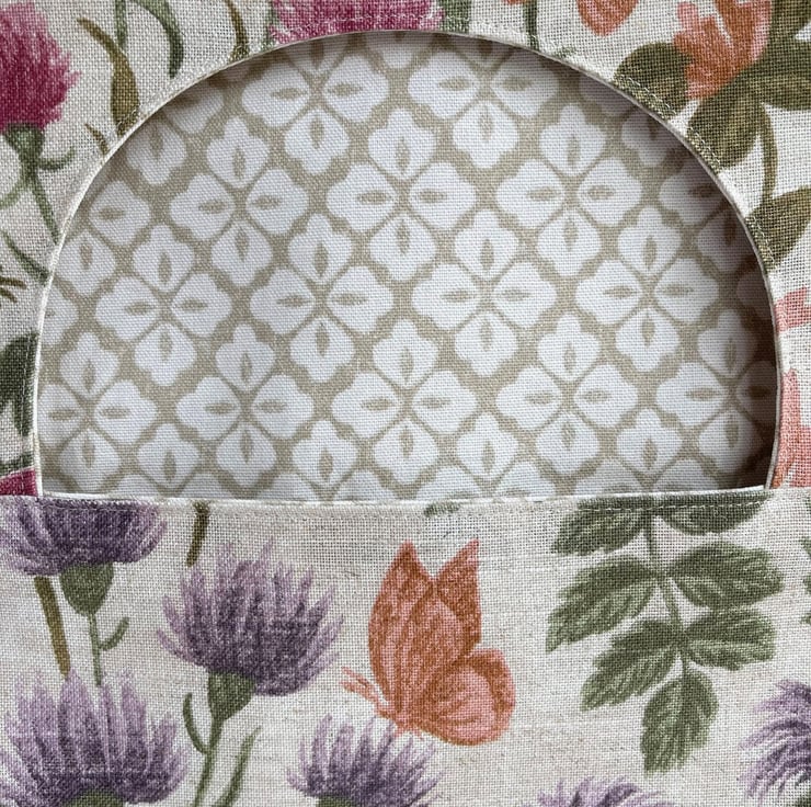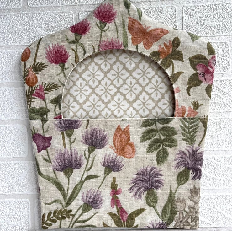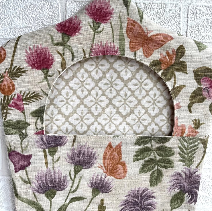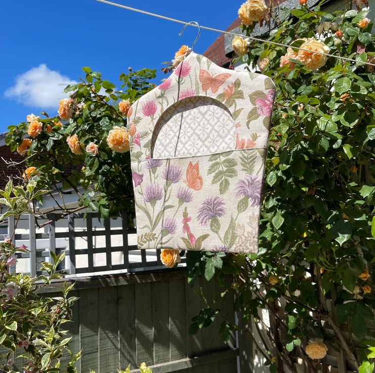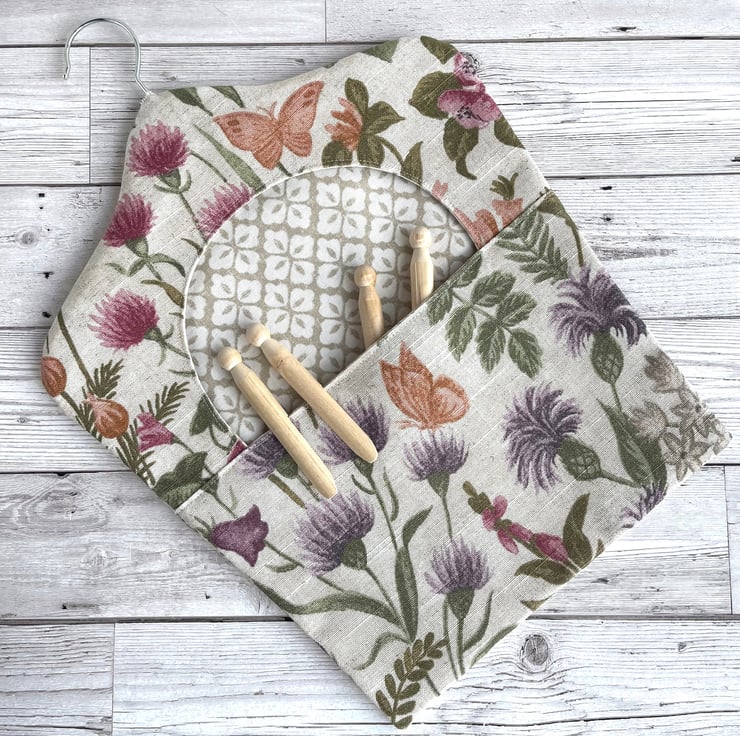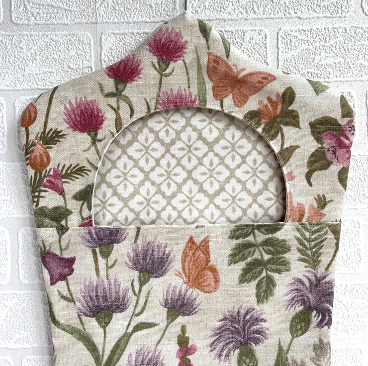 Wildflowers peg bag with butterflies. This useful peg bag is made from fabric with a delightful wildflowers print pattern, which is depicted in shades of purple, pink, sage green, peach, orange and grey on a cream background. The pattern features many varieties of British wildflower, including foxgloves, thistles, clover, knapweed and honeysuckle. There are also a few butterflies amongst the flowers. The bag is lined with fabric with a lattice pattern of quatrefoils in beige and cream. The large opening allows easy retrieval of the pegs from inside, as well as revealing the inner fabric, which complements the outer fabric really well. There are no raw seams, so the bag could be reversed if desired. The hanger is a good quality wooden hanger, and can be removed from the bag.