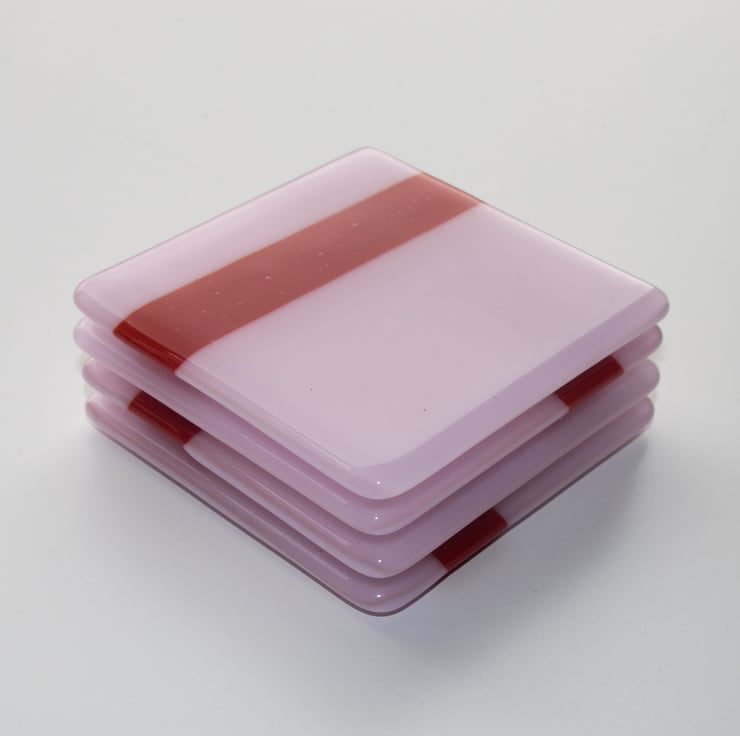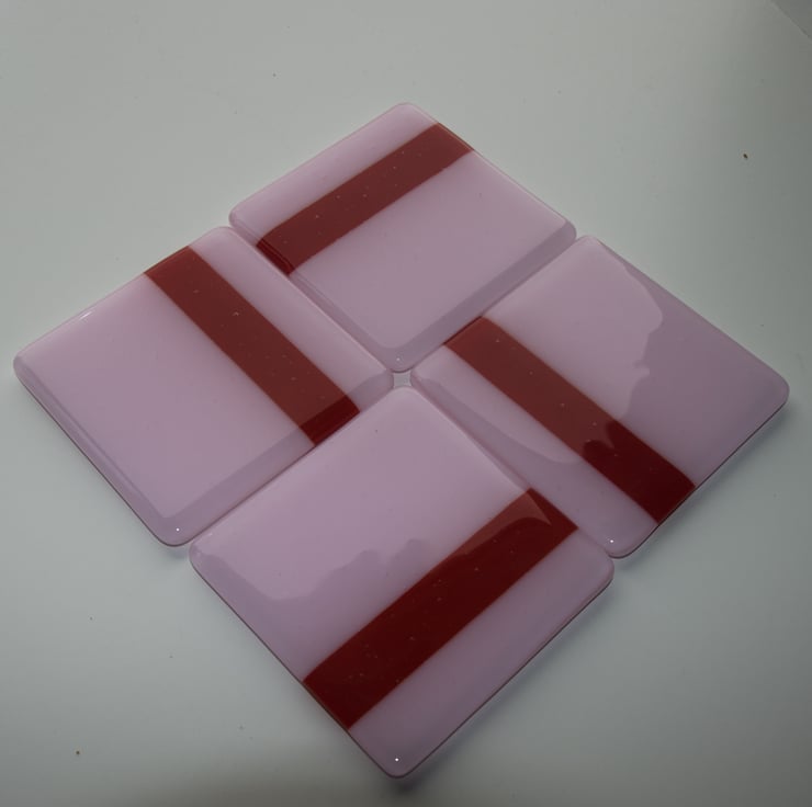Each coaster uses the same design - a square of Pale Pink with a Red stripe. They are each approximately 10 cm square and have little rubber feet fixed to the base to stop them from slipping around.