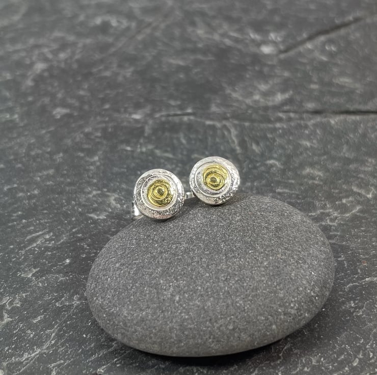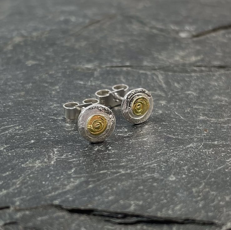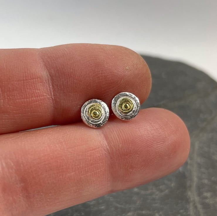 Thick circles of silver have a centre of 18ct yellow gold, a hammered texture and a pattern of stamped circles.