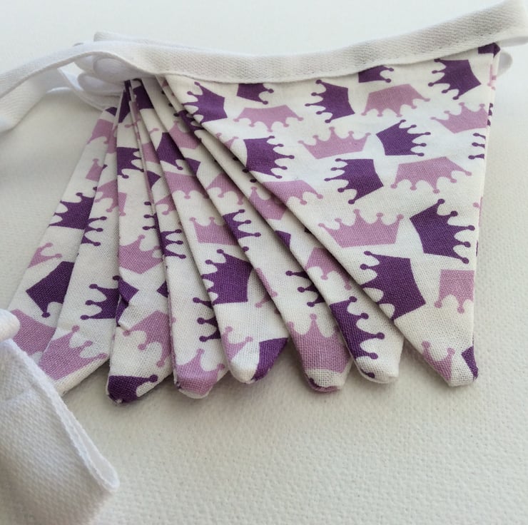 Purple Princess Crown Bunting in Lilac and Purple Crowns pattern on a white background. Perfect for bedroom decoration, birthday party or playroom.
