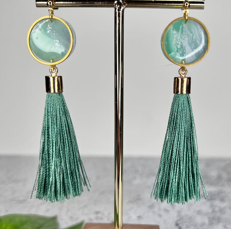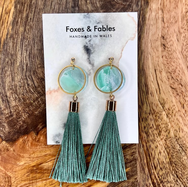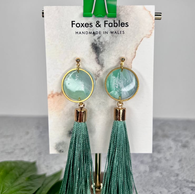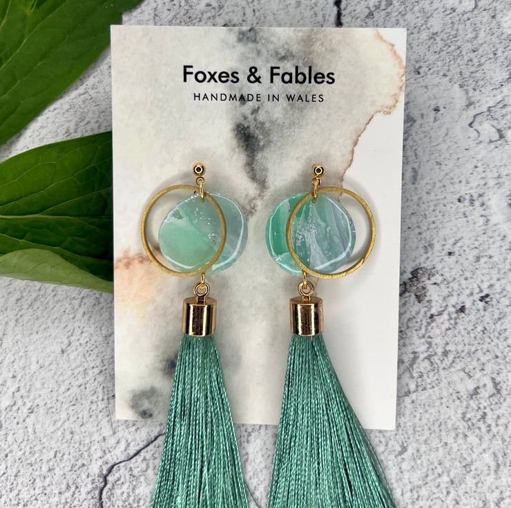 Stunning statements handmade earrings with teal tassels. Blue/green sea inspired round clay droppers with circular brass charms and tassels. Made with gold plated nickel free studs.