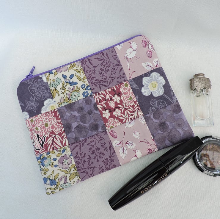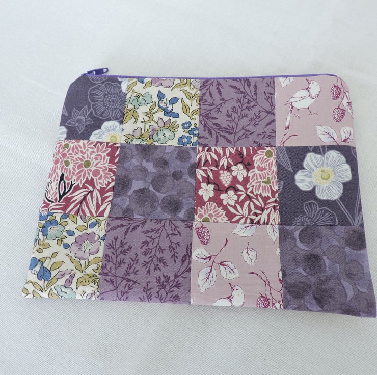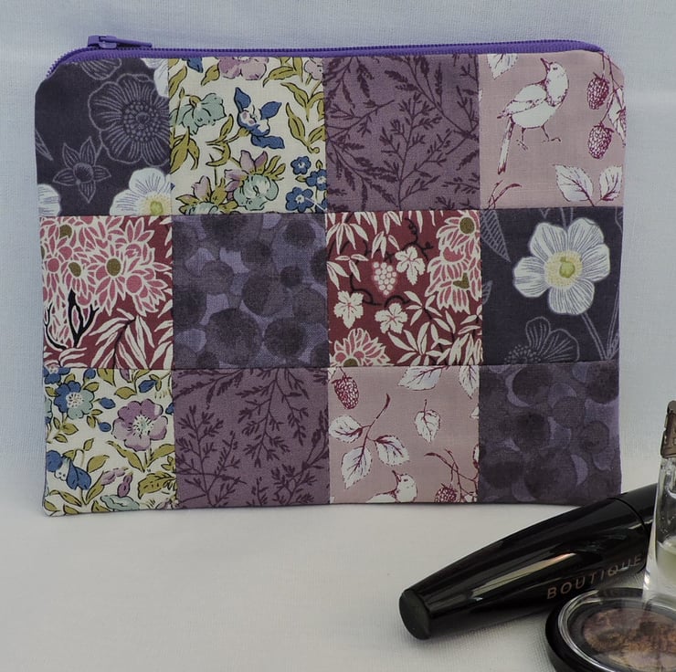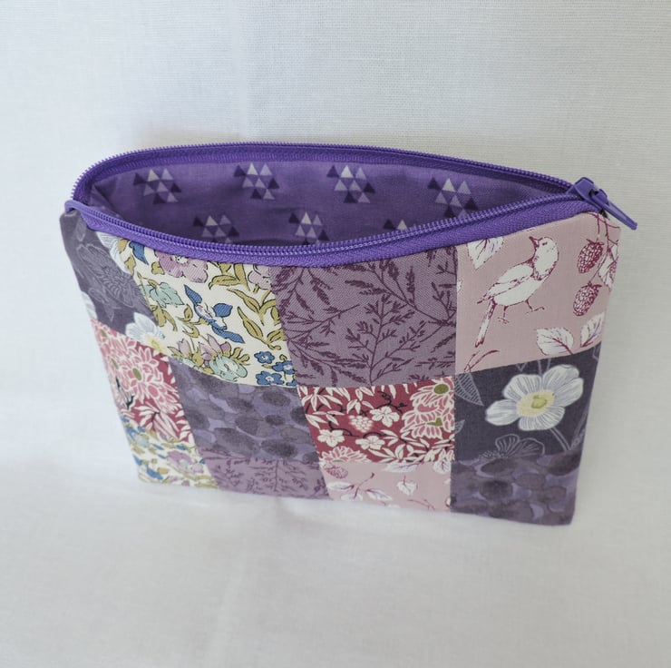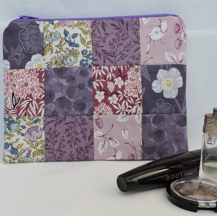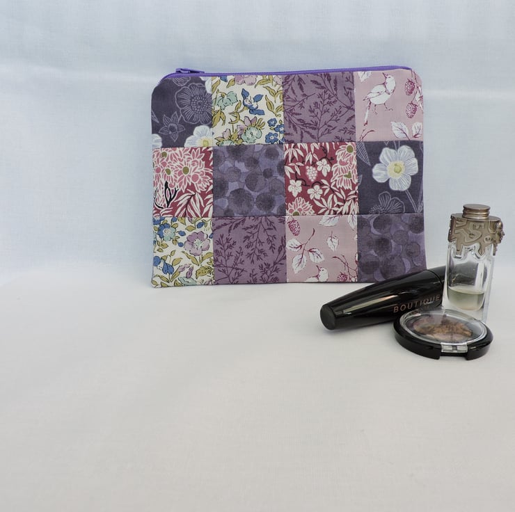 A handy patchwork make up bag which has been made with assorted floral cotton fabric squares. Colours are mauve, purple, light pink, dark pink, white, green and blue. The inner fabric is a mauve cotton fabric with geometric shapes.. Interfacing has been used to give stability to the bag and is finished with a mauve top zip.