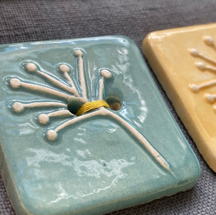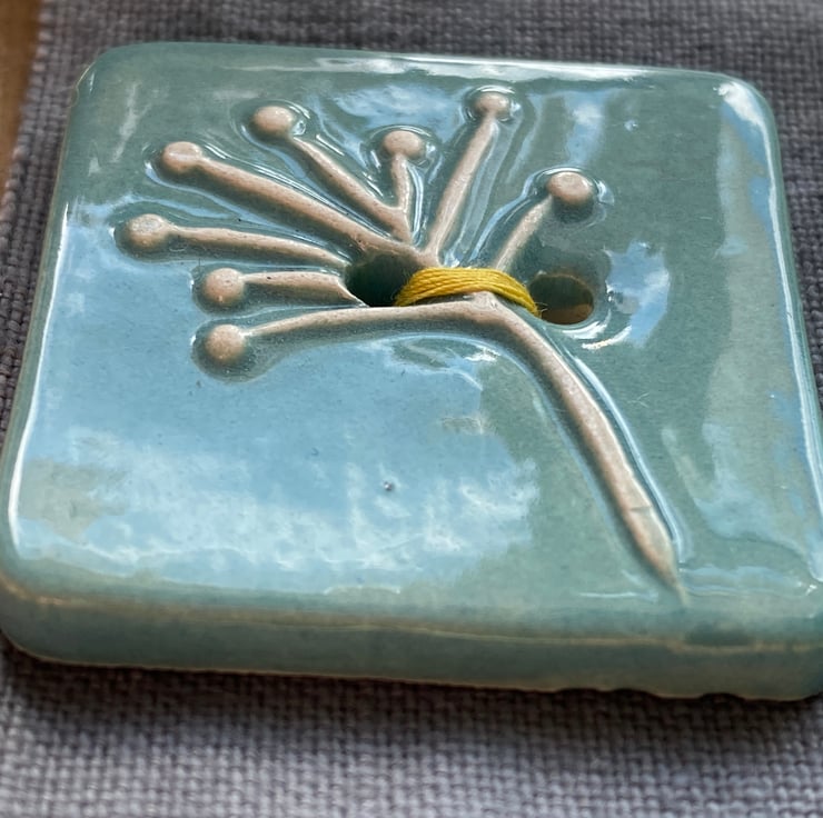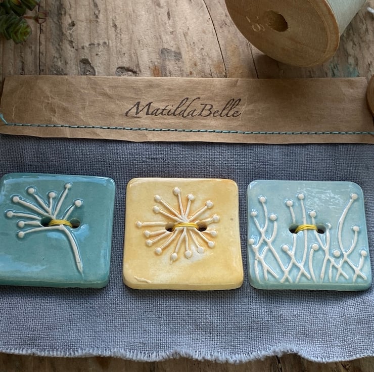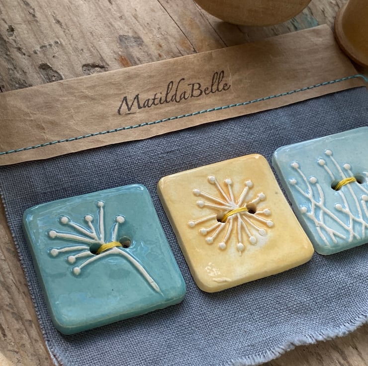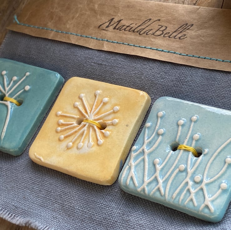 This stunning set of 3 handmade Ceramic Buttons are made from Earthenware Clay. The clay is impressed into original MatildaBelle carvings to give the beautiful raised design which is so tactile. Each button has a different seed head design and is glazed in individual contrasting colours of Sea Green, Yellow and Blue.