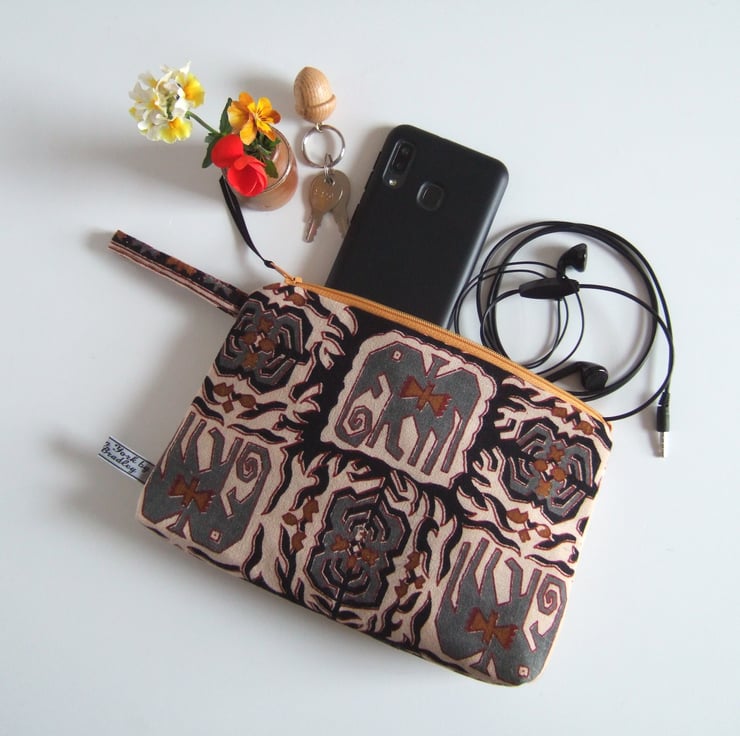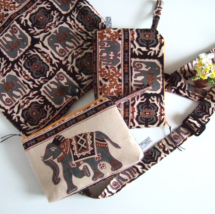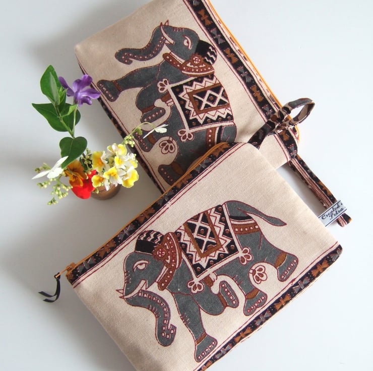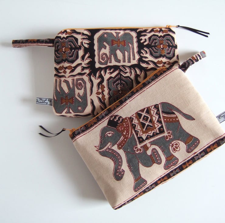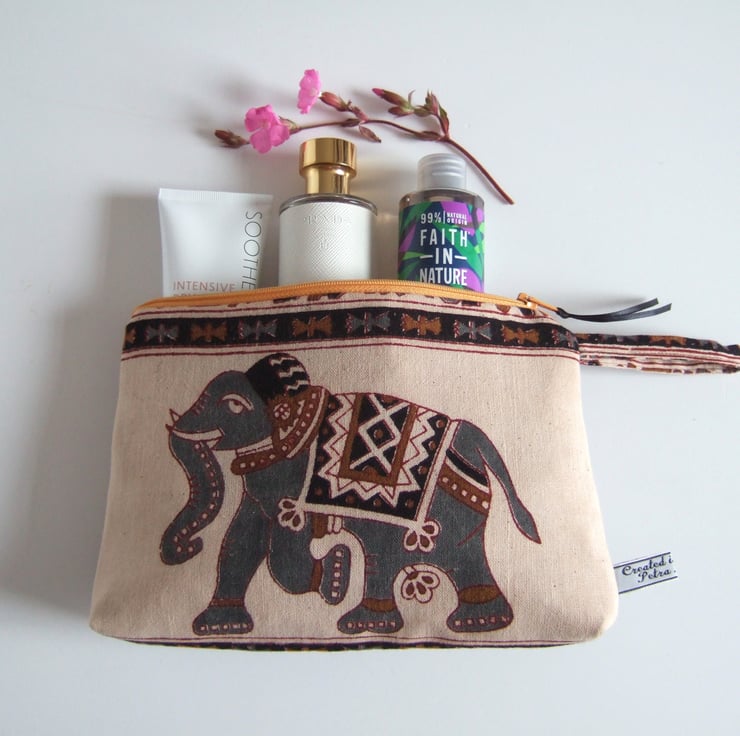 Elephants are everywhere on this charming vintage Indian fabric. Probably made in the 1970’s, there is a lovely handmade quality to the printing, with its childlike elephants. Perfect for taking on trips away, this little bag will carry passports phones and headphones, as well as toiletries and cosmetics. It can also double up as a handbag organiser.