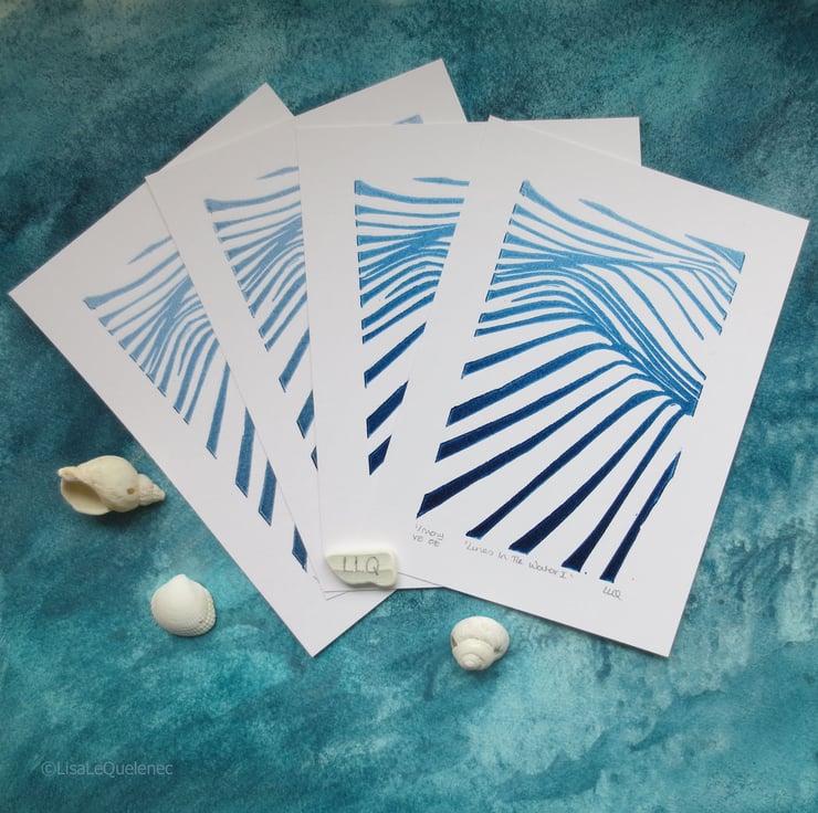 A contemporary print showing the linear flow of waves and water observed at the water's edge. This is an open and varied edition of prints that are printed in different watery colourways as can be seen in group photographs and is part of an ongoing series.