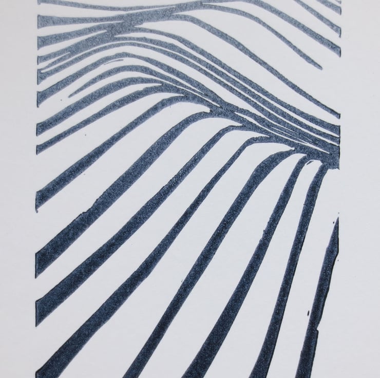 A contemporary print showing the linear flow of waves and water observed at the water's edge. This is an open and varied edition of prints that are printed in different watery colourways as can be seen in group photographs and is part of an ongoing series. The print in this listing is in shades of a denim storm grey colour.