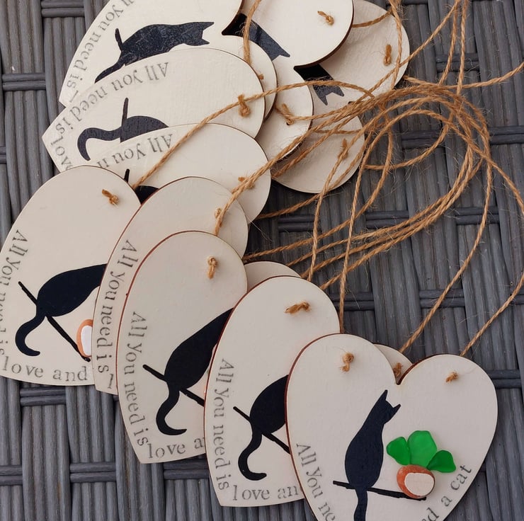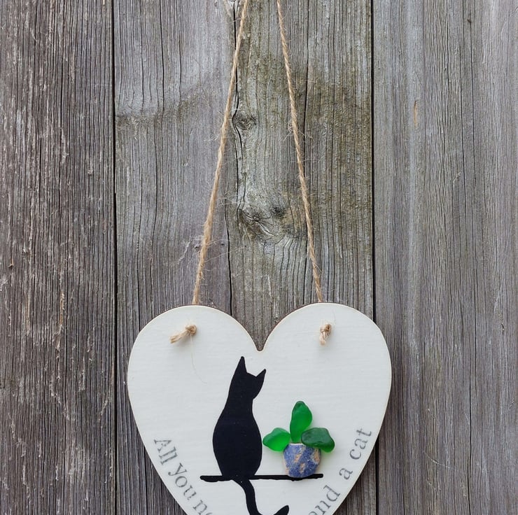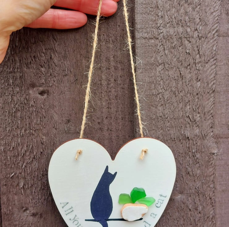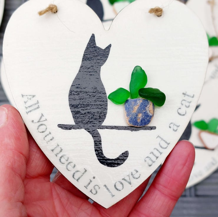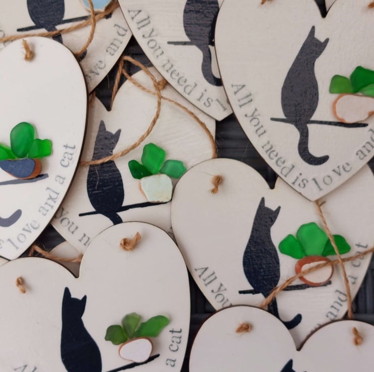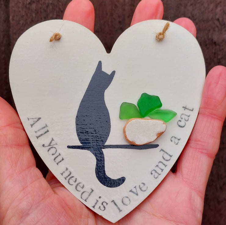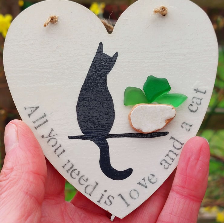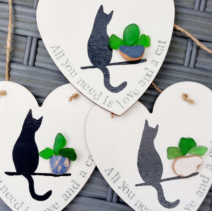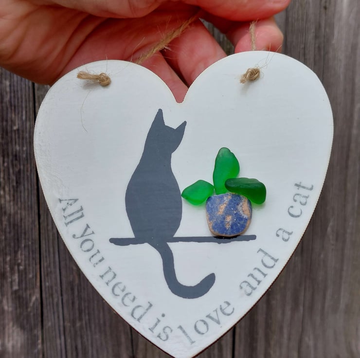 Each hand made heart is perfectly unique and features a silhouette of a cat, sitting next to a plant pot created from naturally formed sea glass and pottery collected from my beachy travels. The words 'All you need is love and a cat' have been hand stamped along the edge and the whole piece has been sealed to give a glossy finish. This has been strung with natural jute so it's ready to hang.