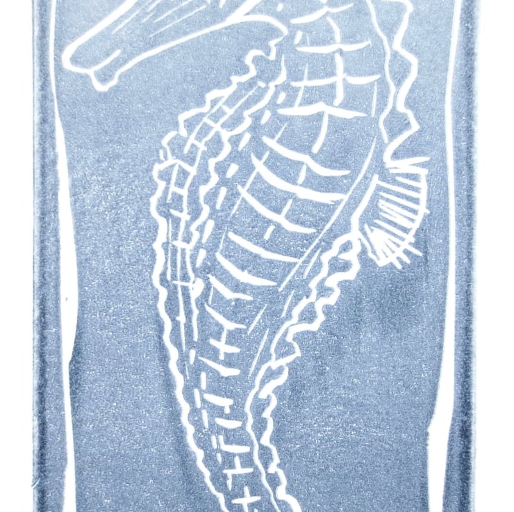 Handmade handprinted art card of a seahorse in soft denim blue grey ink. Perfect for shell collectors, beachcombers and mermaids everywhere.