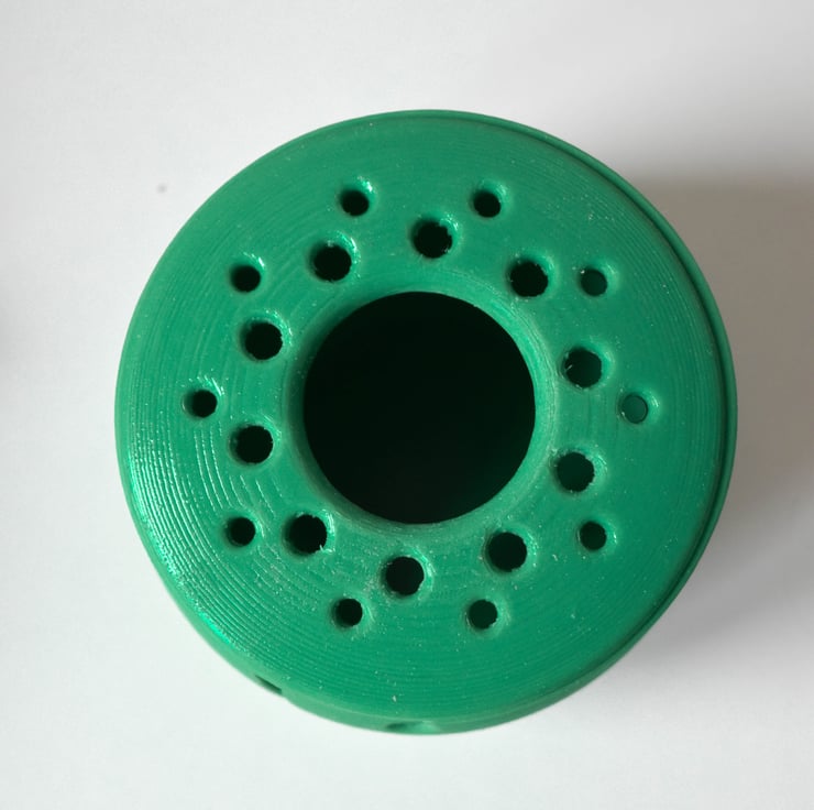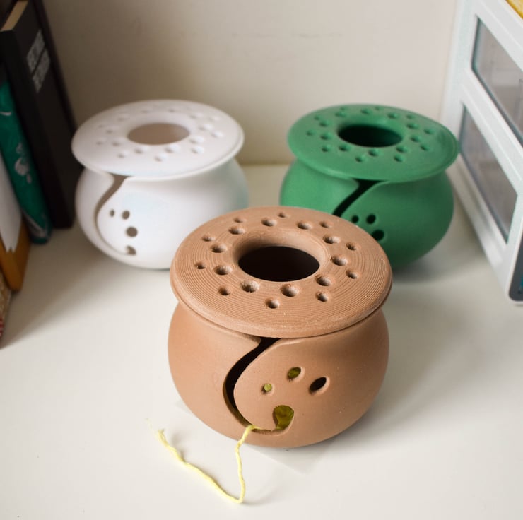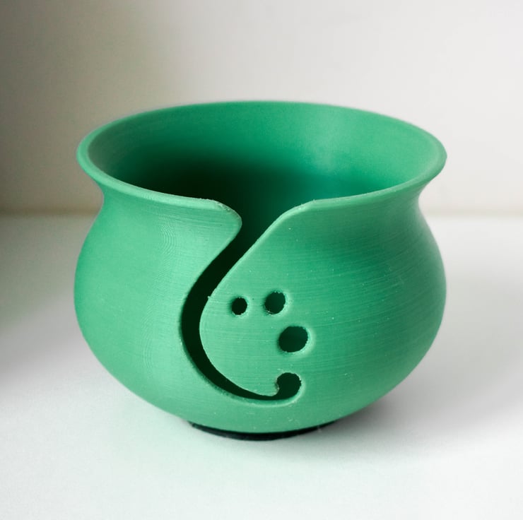 This yarn bowl has been 3D printed using PLA filament. The bowl is a green in colour so would fit in with any living space or work room.