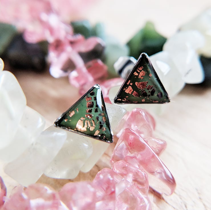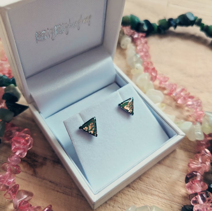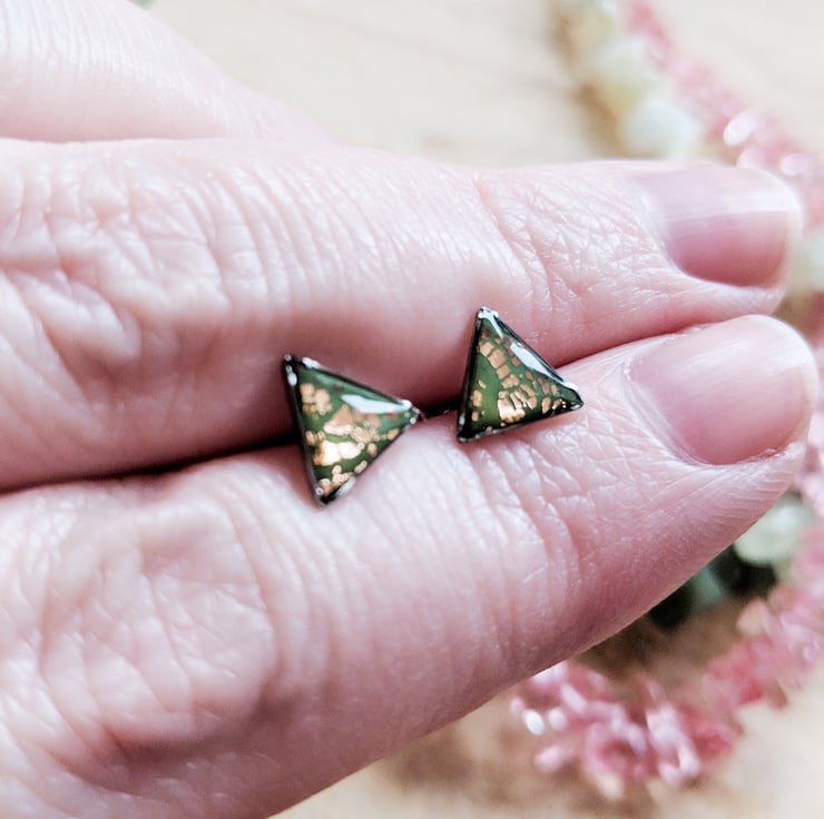 Sage green and rose gold triangle stud earrings. Unique polymer clay and resin earrings with stainless steel posts. Pretty Scottish jewellery.