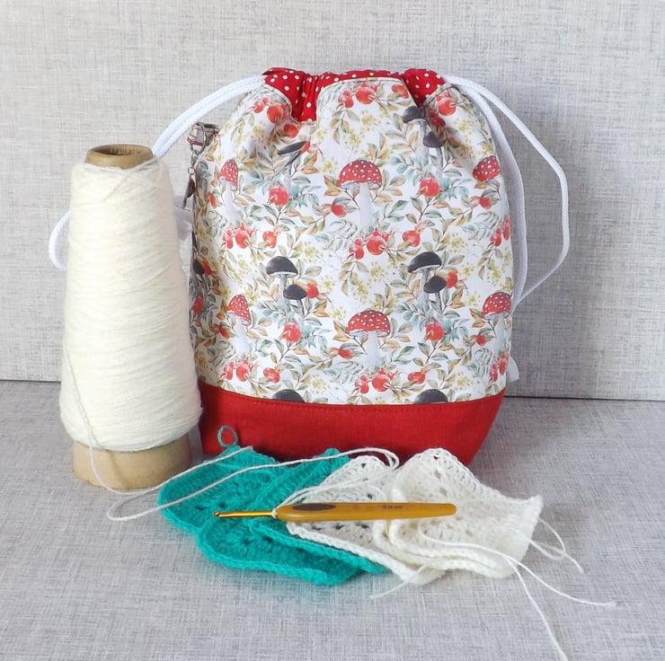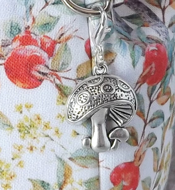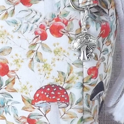 I have included a mushroom charm/stitch holder which is attached to a D ring on one side of the bag.