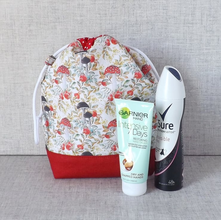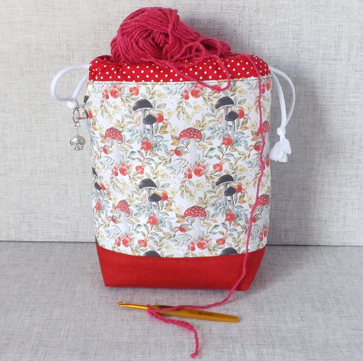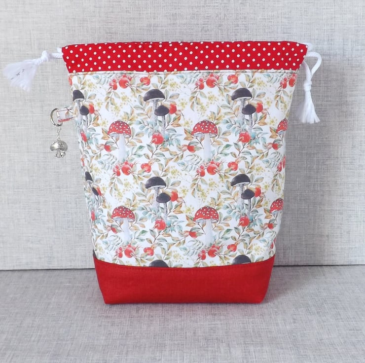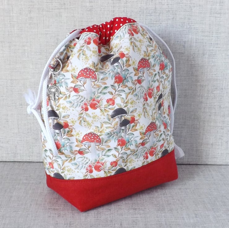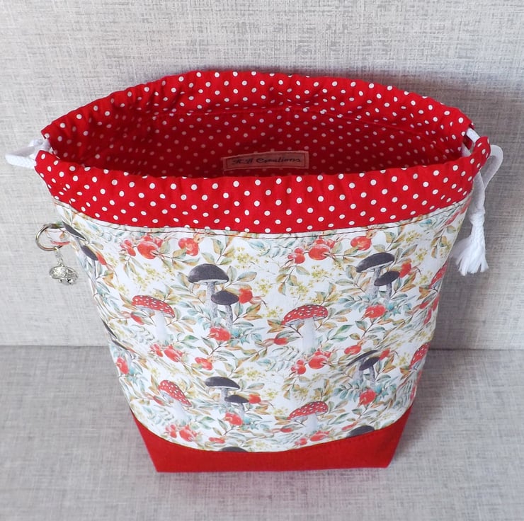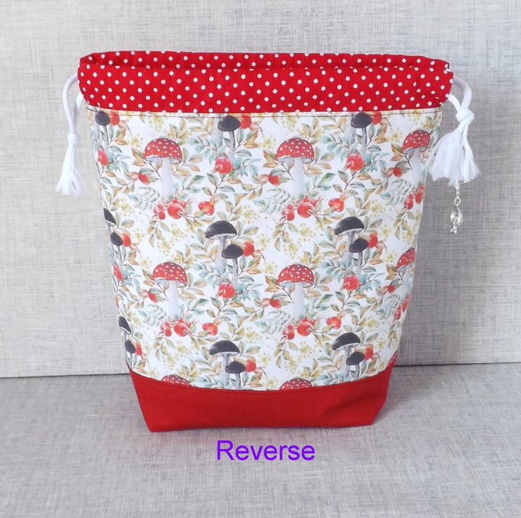 A project bag, drawstring bag, made from a lovely cotton fabric with a mushroom design in red & grey on a white background, combined with a plain red fabric. The lining is a red with white spots cotton fabric, which I have also used to create the channels for the white drawstrings.