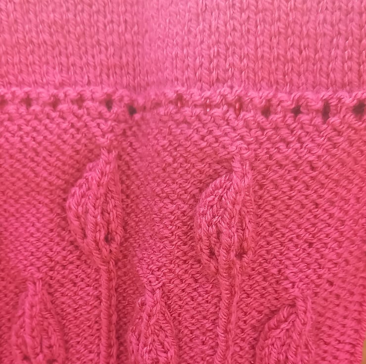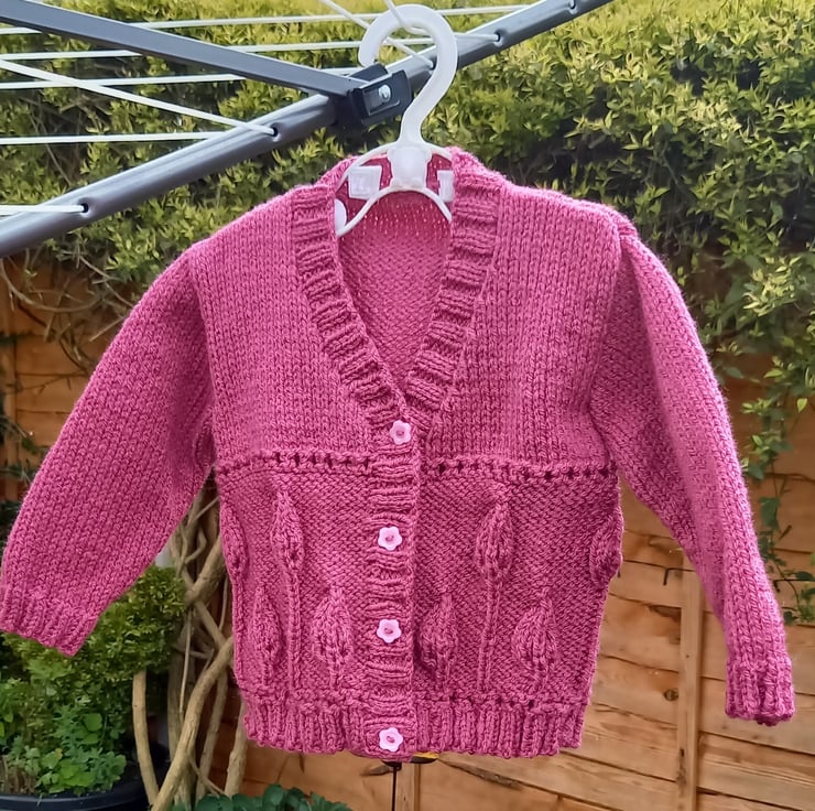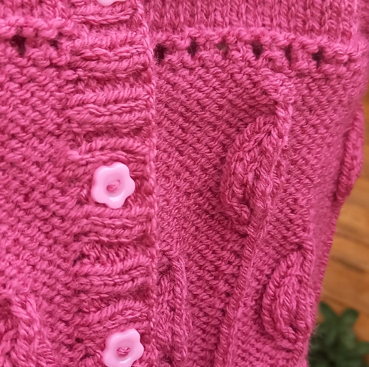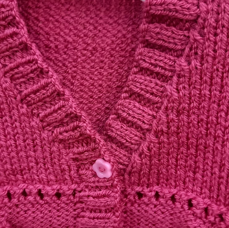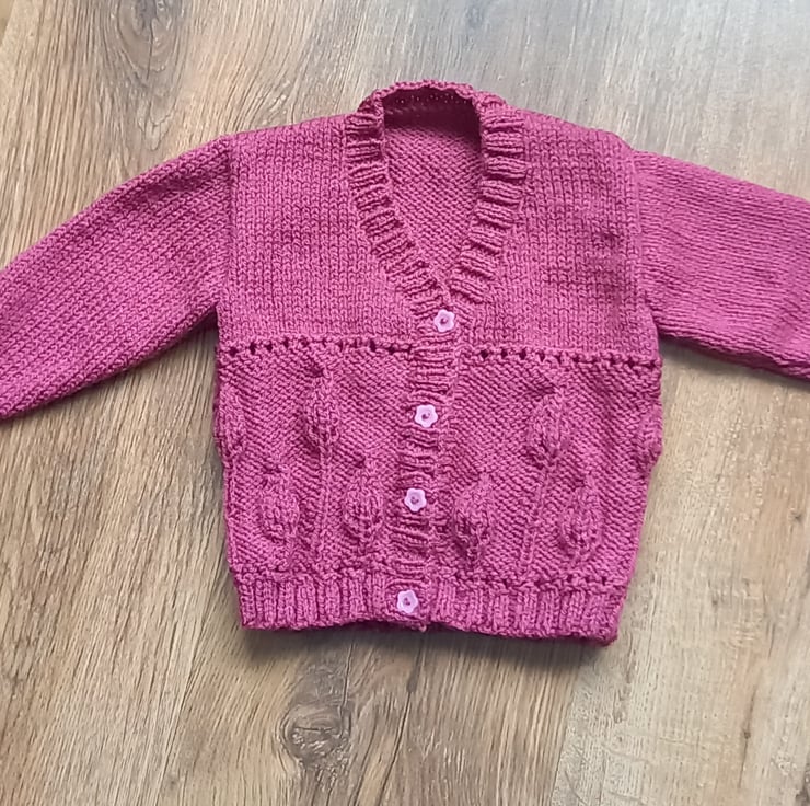 Pretty deep rose colour baby girls cardigan, hand knitted in a soft machine washable yarn. The cardigan is v neck and is knitted in a mixture of garter stitch and stocking stitch, with a flower design below a row of eyelets, and fastened with 4 pale pink flower buttons.