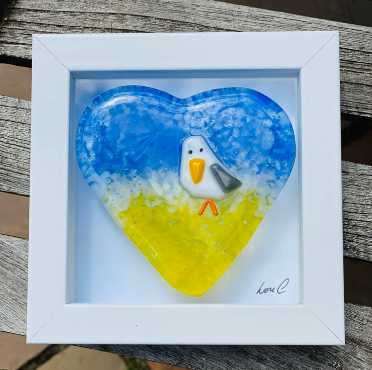 Ready to hang this gorgeous cast glass heart with seagull is just adorable. The heart measures 4 inch diameter and the frame size is 5 inch square . Ready to hang directly on your wall. Fused glass will add light and interest to your home .