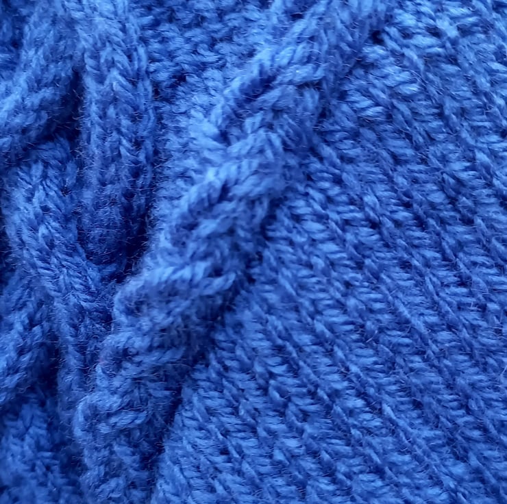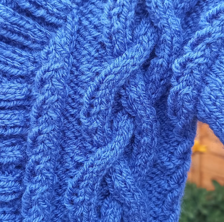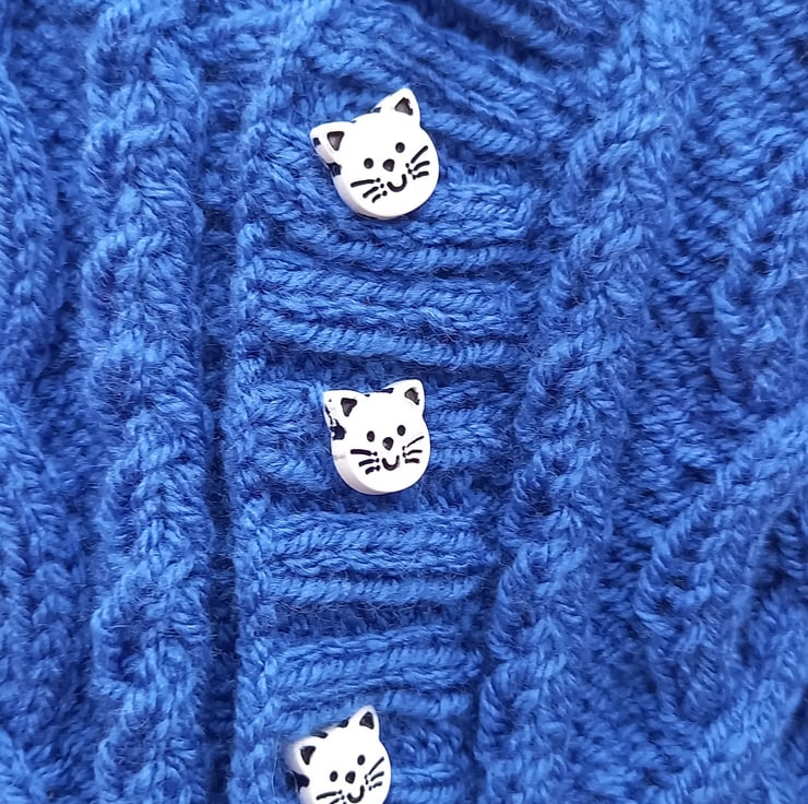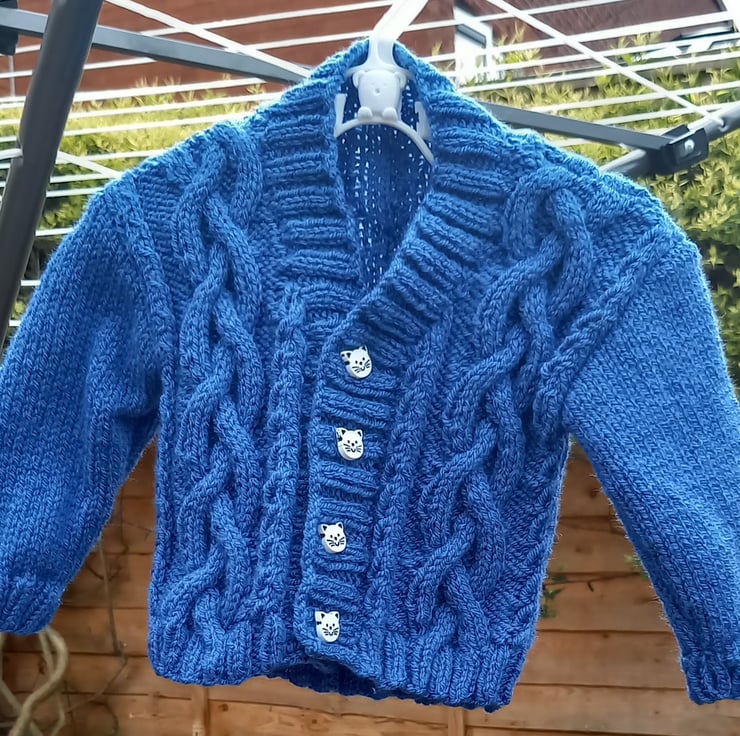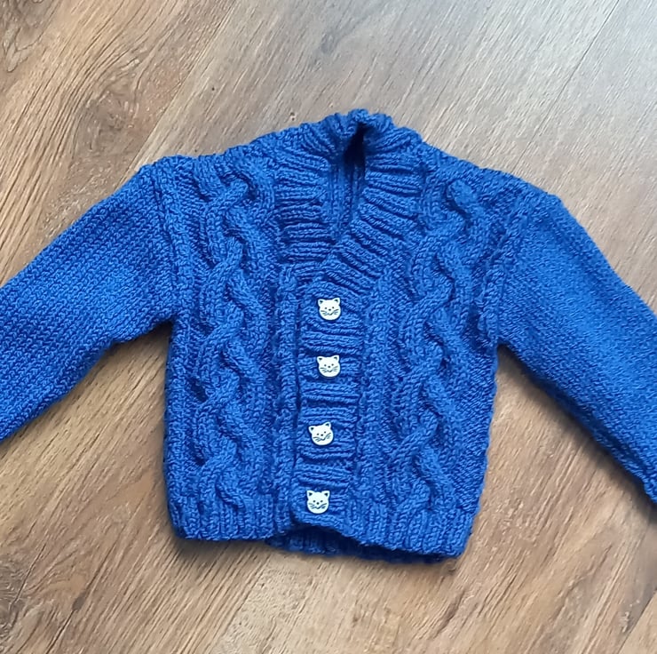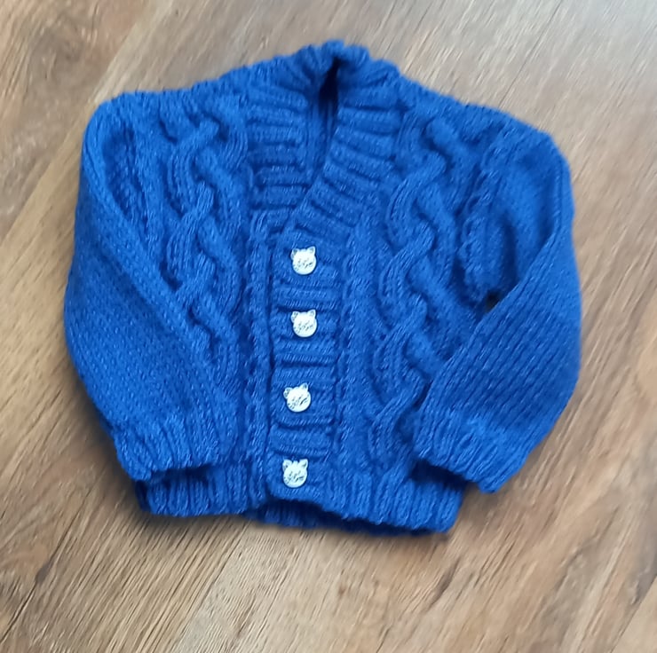 Lapis blue v neck baby cardigan, hand knitted in machine washable yarn, in an intertwining cable design up the front sides and the back, with smaller cables also up the sides and center of the back, with 4 white cat buttons.
