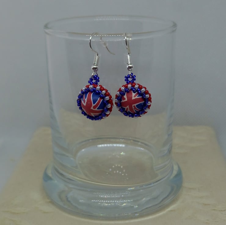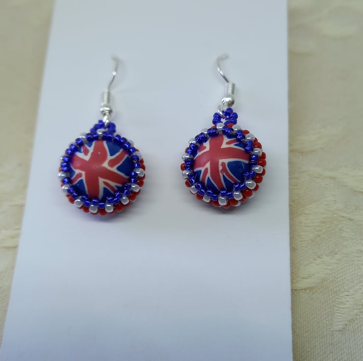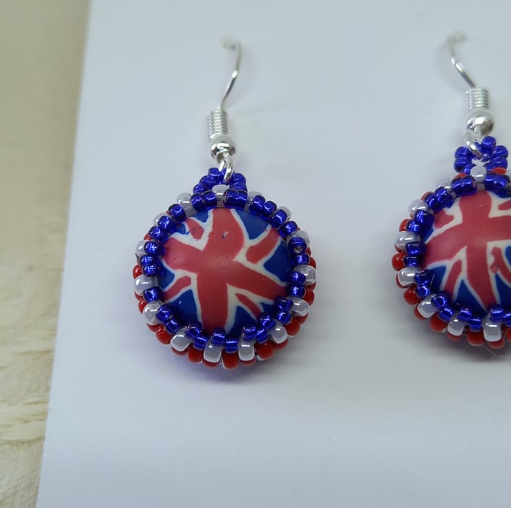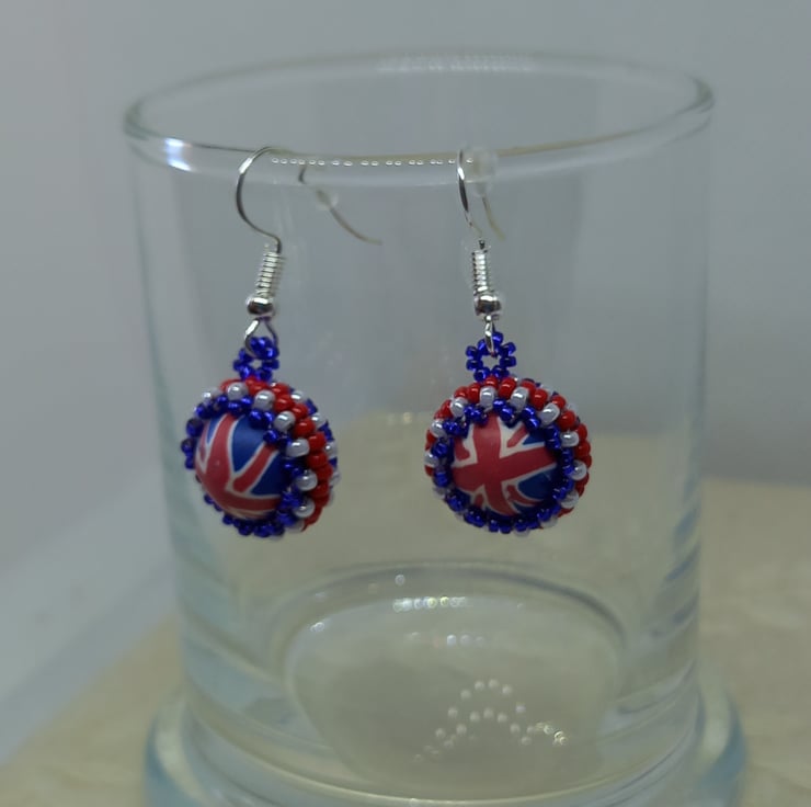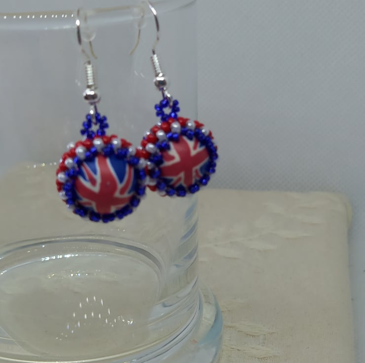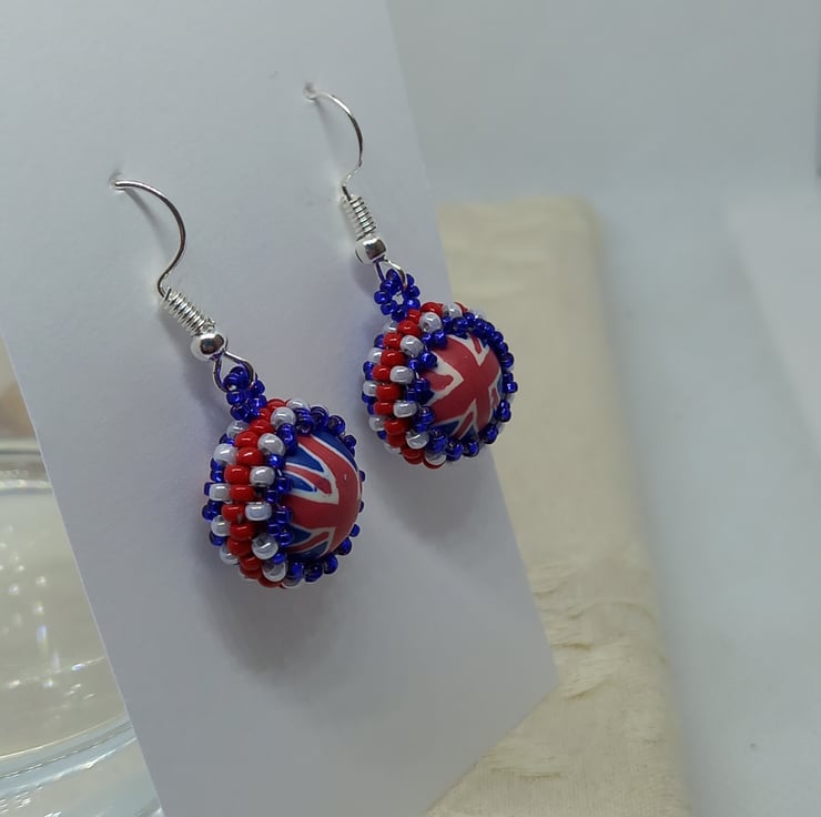 Make a patriotic statement with these fun polymer clay and beadwork earrings. A central bead is surrounded by red, white and blue miyuki seed beads using peyote stitch. With silver plated earring hooks and plastic stoppers, they measure approx 2cm in length (not including ear hooks).