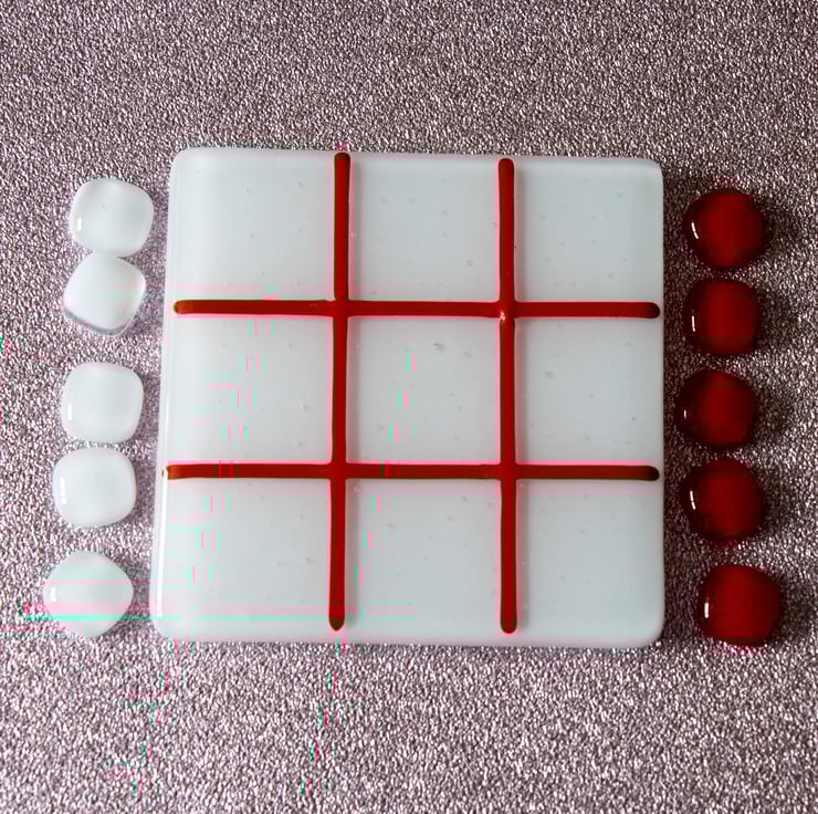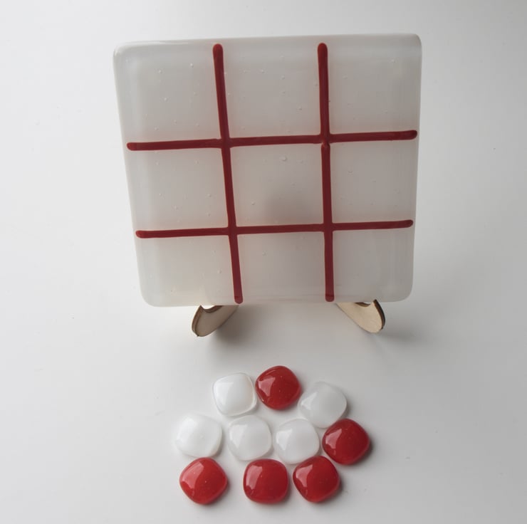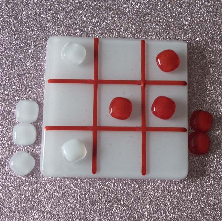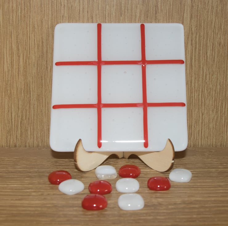 We use a 10 cm square coaster as the playing board. The background is white and the grid is red - the colours of St George. The game includes two sets of glass counters for you to mark your move - one set is white and the other is red.