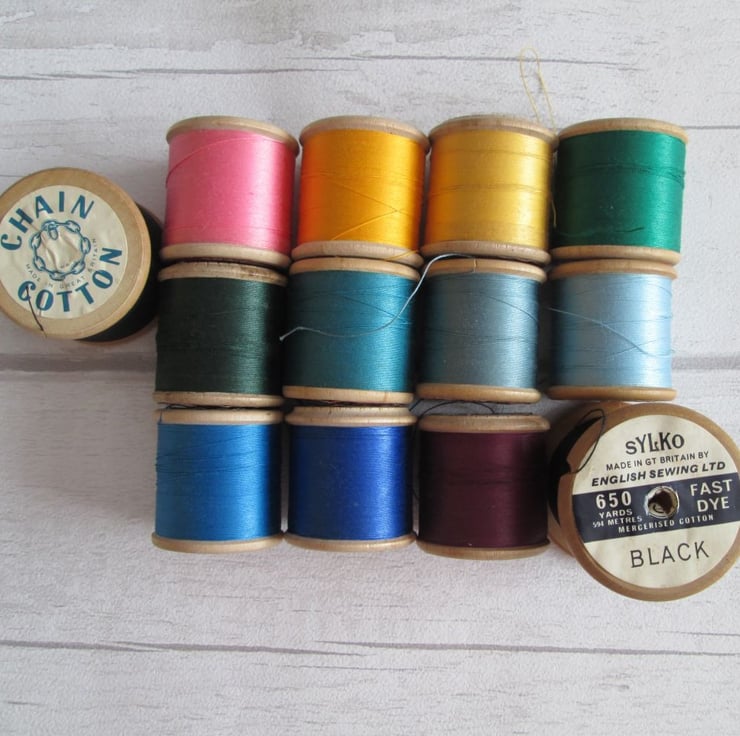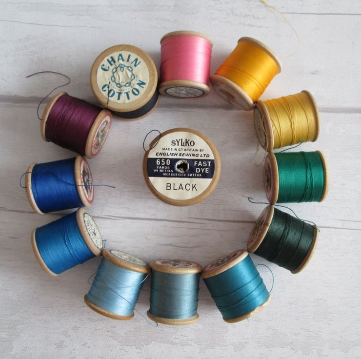 My final set of vintage threads on thirteen wooden reels plus an empty Sylko reel as a makeweight. There are two reels of black - one J.&P. Coates 'Chain' Machine Cotton, the other a large Dewhurst's Sylko reel - plus eleven colours (all Sylko). Ideal for mixed media use or general craftwork.