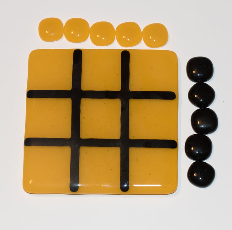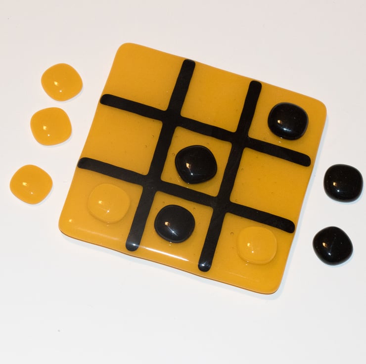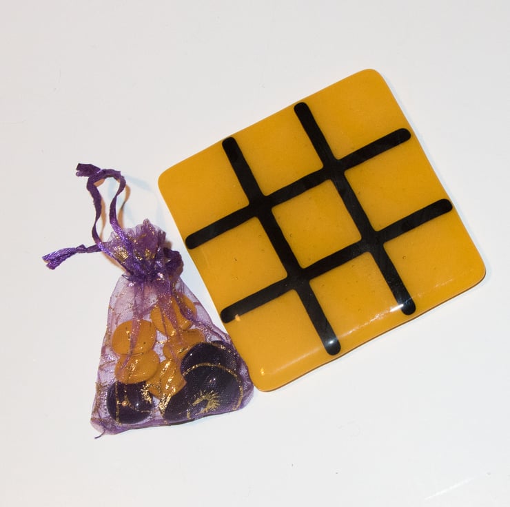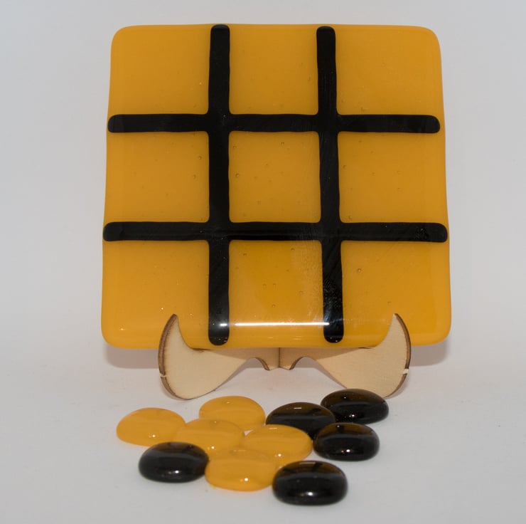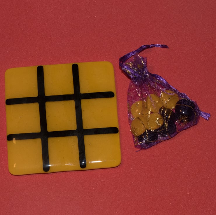 We use a 10 cm square coaster as the playing board. The background is Yellow and the grid is black - the colours of a well known Midlands football team. The game includes two sets of glass counters for you to mark your move - one set is yellow and the other is black.