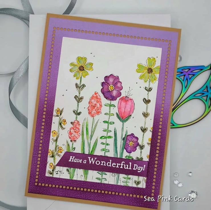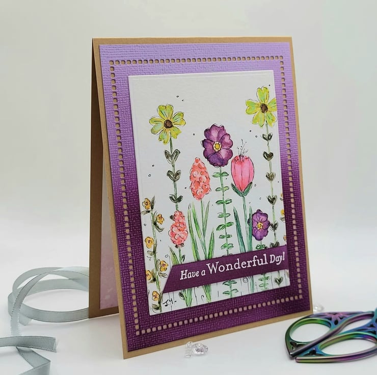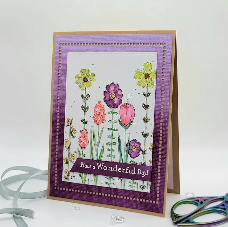 A unique blank floral card measuring 10.75 x 14.5 cm and hand-painted with watercolours. Featuring colourful doodle style flowers on a white watercolour card panel. The base is handmade from smooth Kraft card and the inside is blank with a white card panel. There is a purple ombre card frame. Perfect for writing your own greeting or note. There is a small heat-embossed sentiment on the front, in white on a dark purple background HAVE A WONDERFUL DAY!
