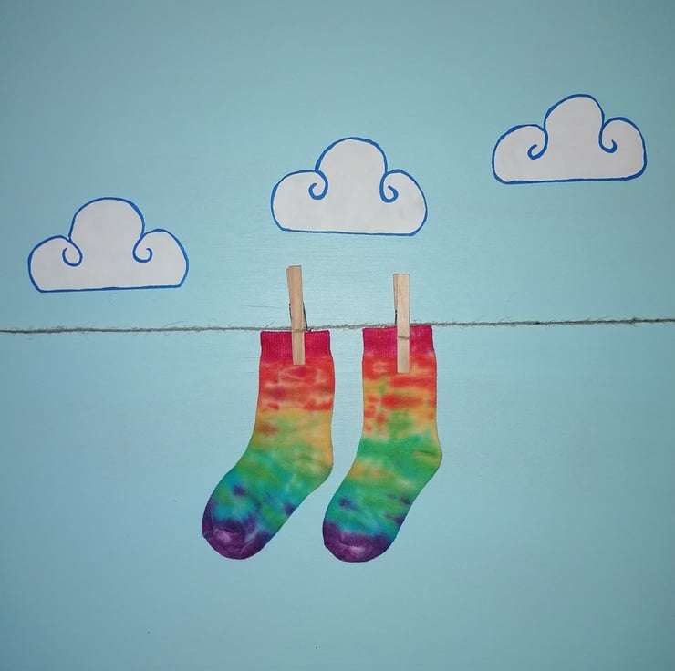 Using a cotton sock, I apply liquid dye in vibrant rainbow colours - red, orange, yellow, green, blue and purple.
