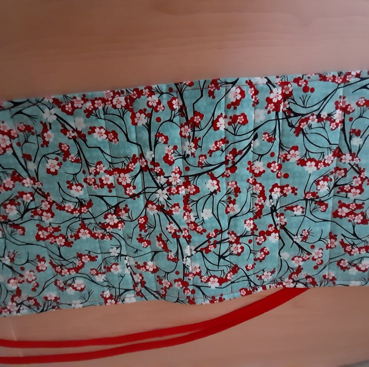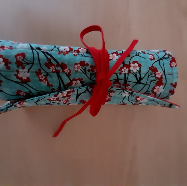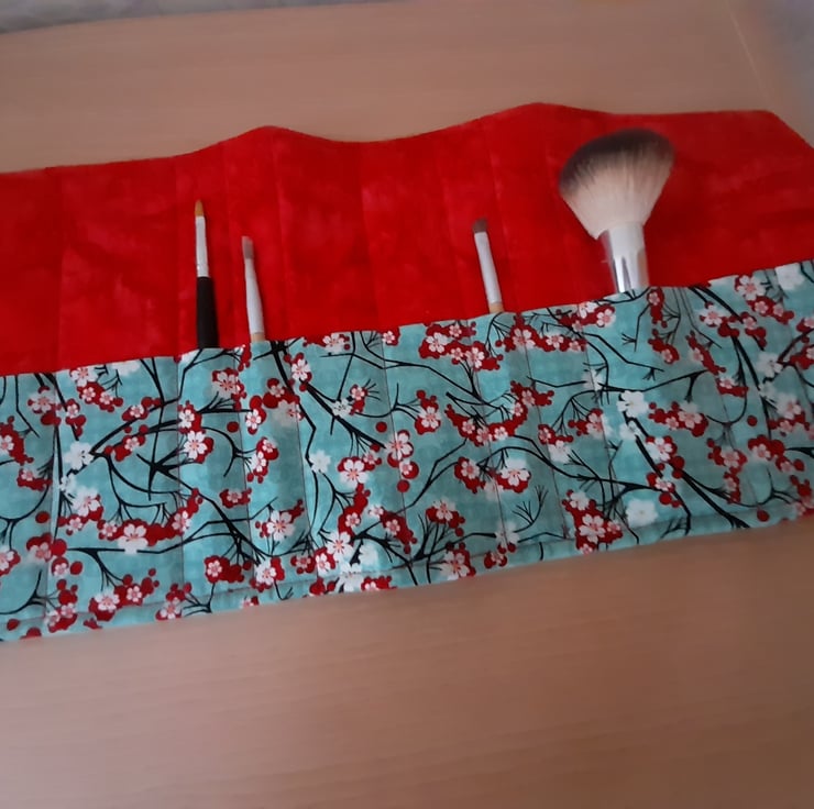 Makeup brush holder made from 100% cotton. Outer shell is a Japenese fabric and the lining is batik. 13 channels for different size brushes. Ties to secure when rolled. Washable.