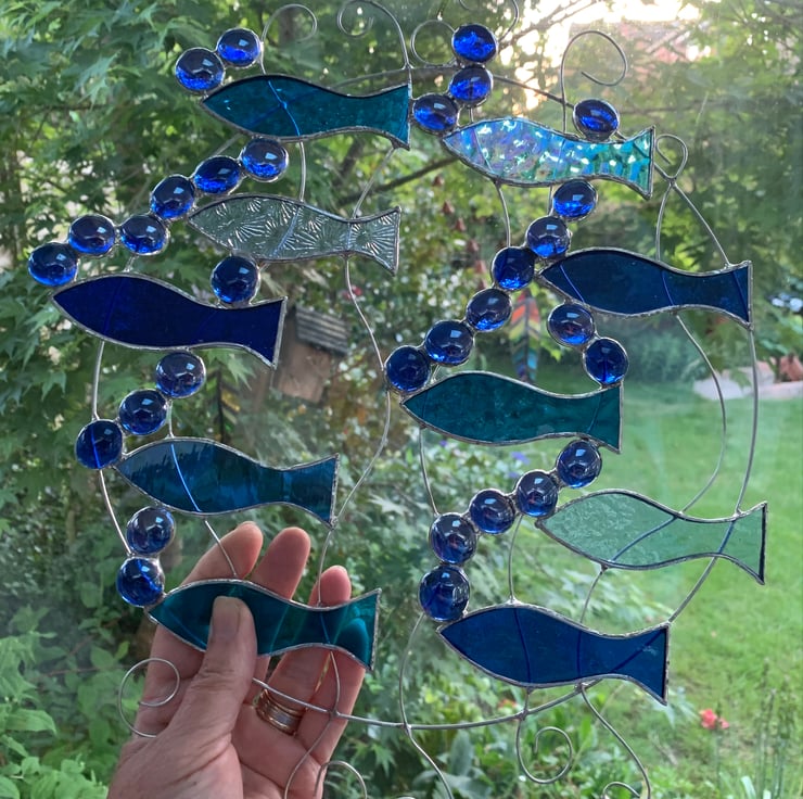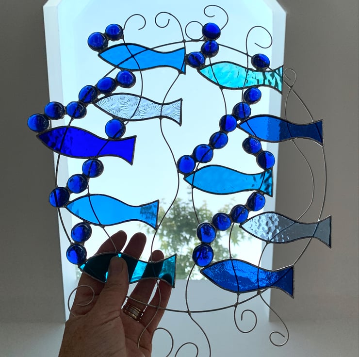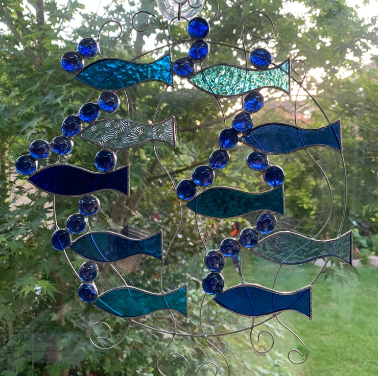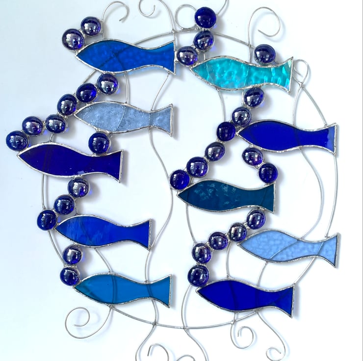 This suncatcher has been made of 10 fish, all made from a different texture/coloured stained glass and 31 blue nuggets for the air bubbles.