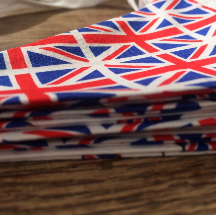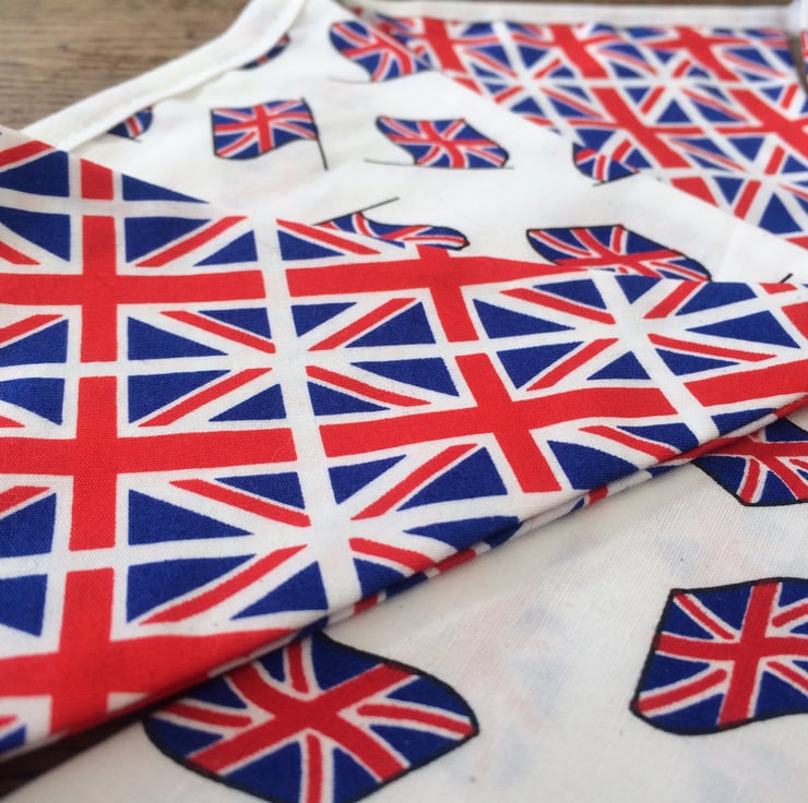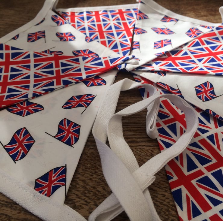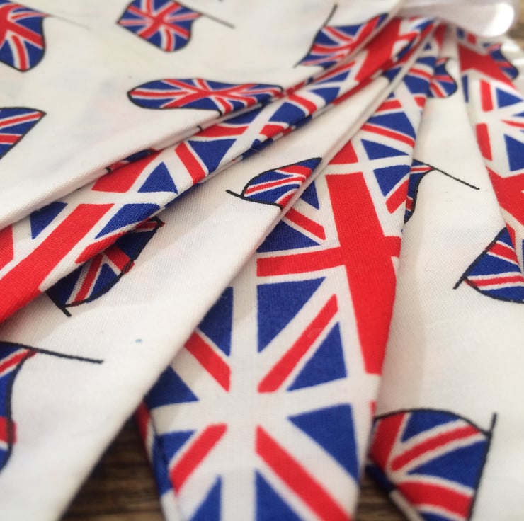 Fabric Bunting made using a selection of Union Jack fabrics. Why not hang it in the garden, at the pub, in the shed, beach hut, picnic or even the front window at home.