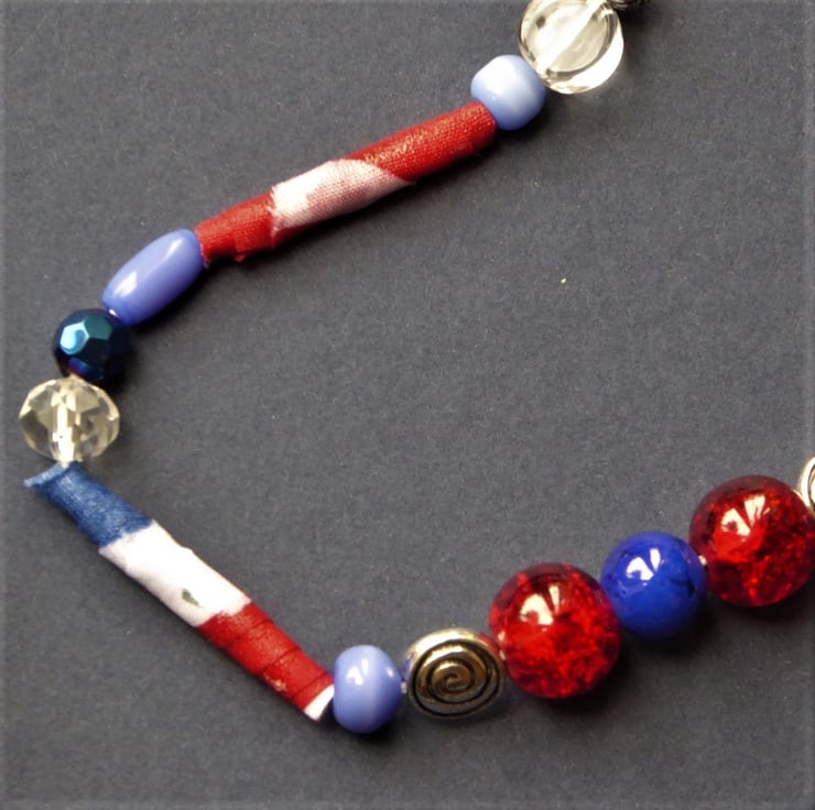 Hand made textile beads are mixed with a generous arrangement of glass/metal and acrylic beads to add just a little sparkle. This light to wear necklace is so comfortable with a soft fabric neckband eliminating tricky fastenings. Colours of red white blue and gold make this suitable for regal or even seaside occasions.