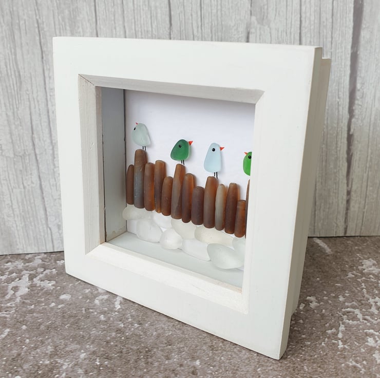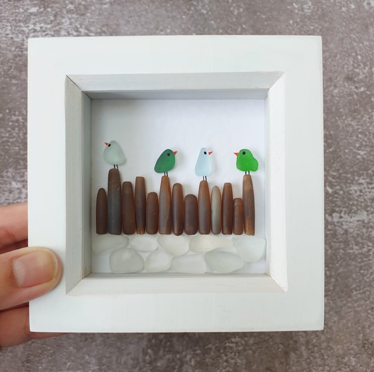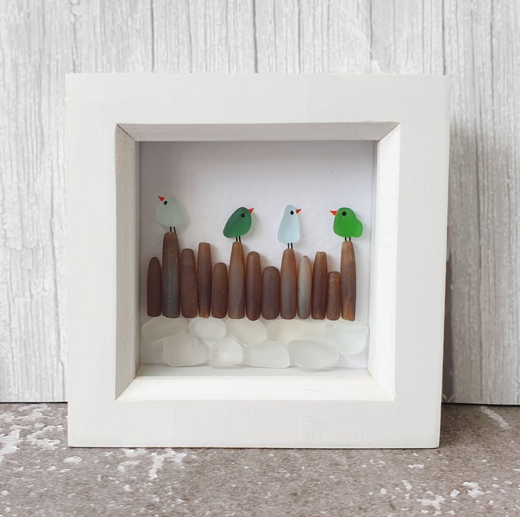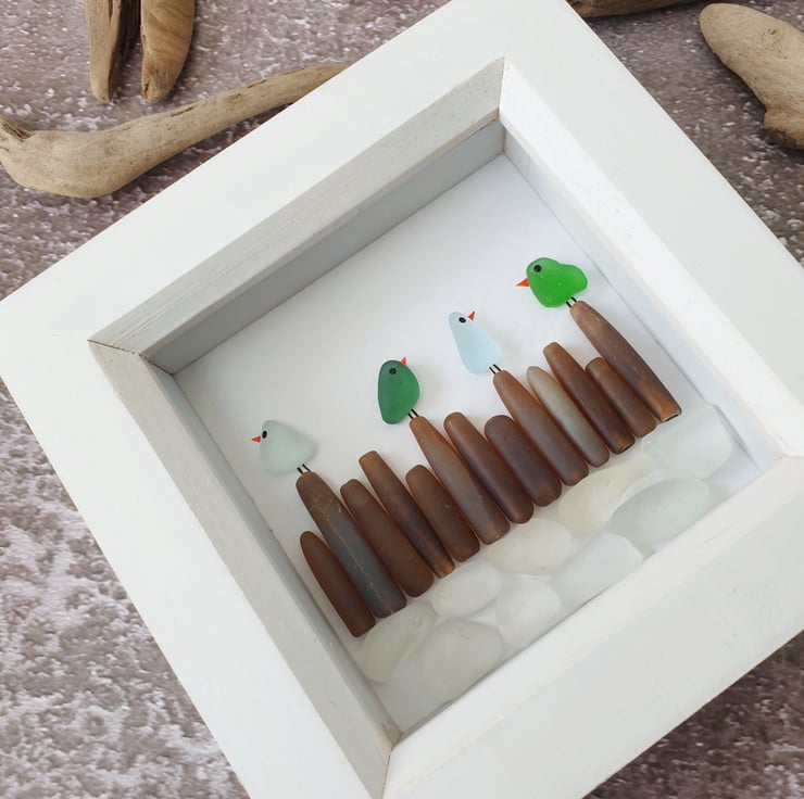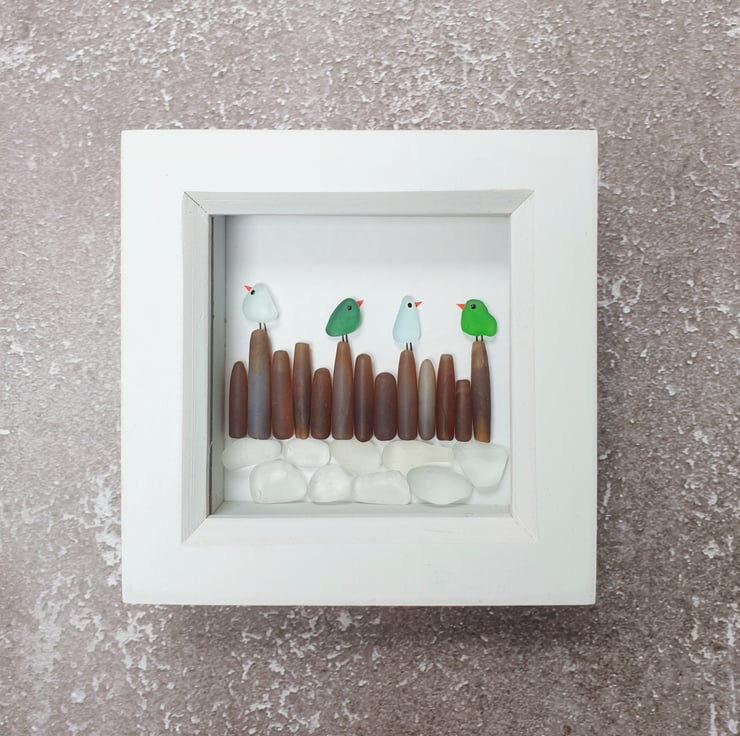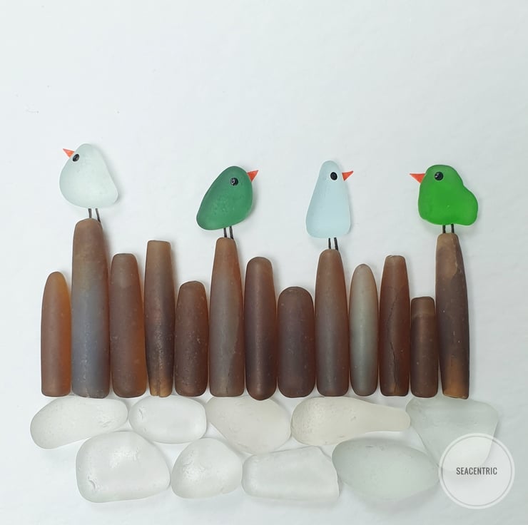 A row of colourful seaglass birds sitting on rocky shores.