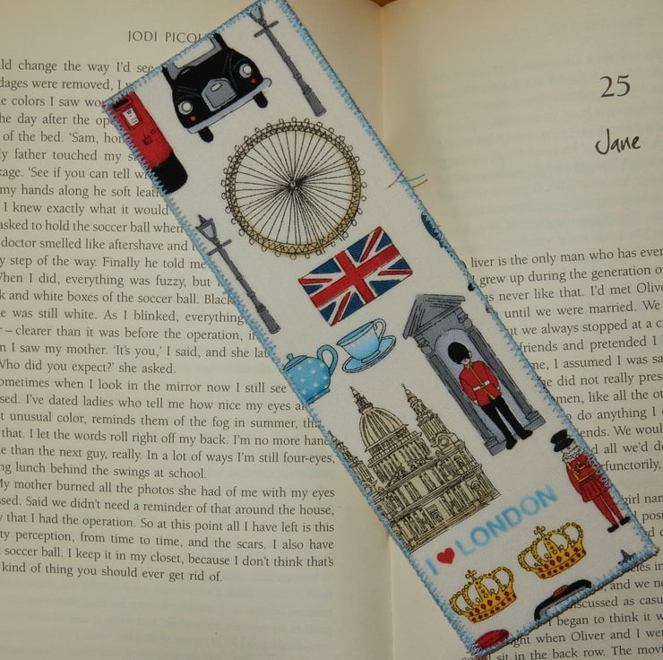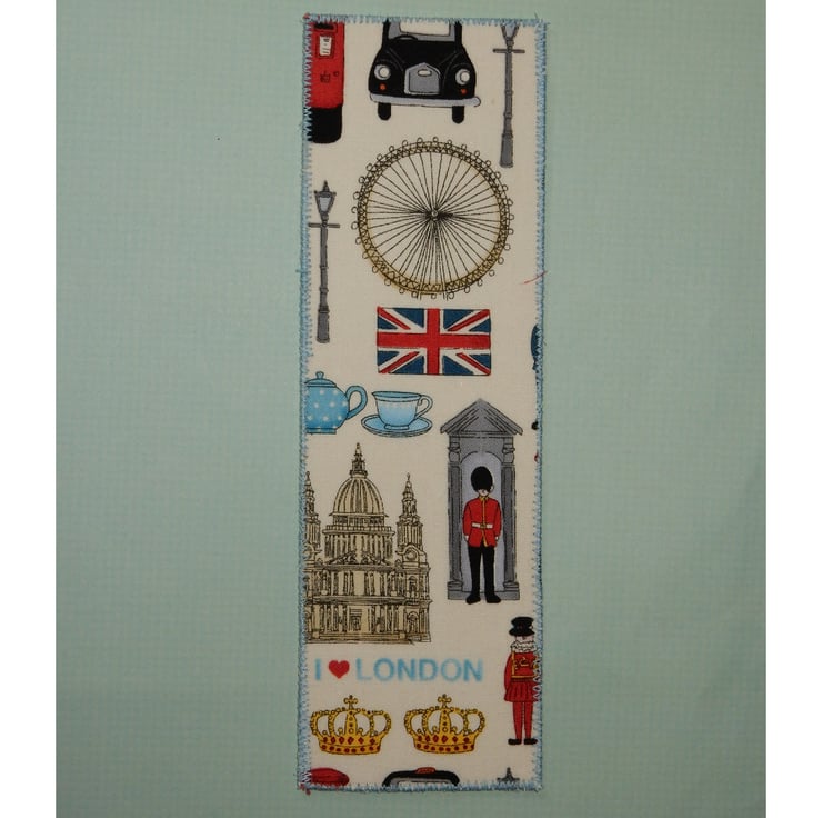 This bookmark celebrates London icons, including the Millennium wheel, a guardsman in his sentry box and St Pauls Cathedral. It is ideal for lovers of London. It measures 2.5 x 8 inches, is made from cotton fabric and has a plain cream fabric on the reverse, and a layer of stiffening in between. The edge is stitched in blue thread. It would be ideal to keep your place in your favourite novel.