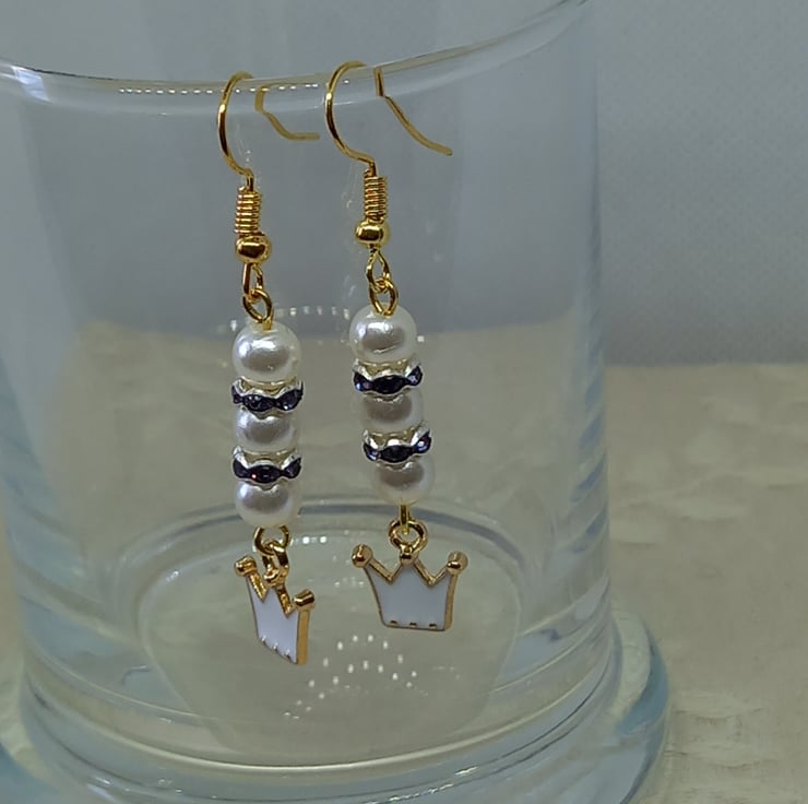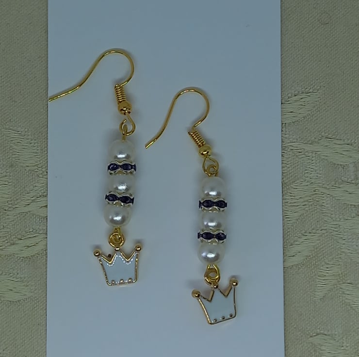 These pretty dangle earrings are composed of white glass pearls with mauve diamante spacers threaded onto gold plated wire, and with a gold and white enamelled crown charm suspended at the base. They are finished with gold plated ear hooks and plastic stoppers. The pearls measure 6mm in diameter and the earrings measure 3cm in length (not including the ear hooks).