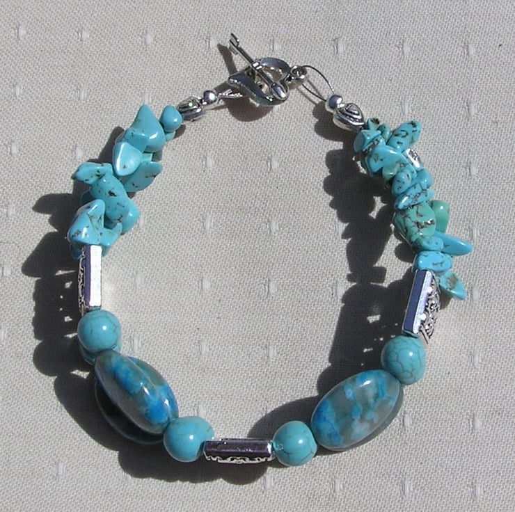 This Stunning Bracelet is made from is made from Oval shaped Blue Crazy Lace Agate Beads with Turquoise Magnesite round Beads teamed Turquoise Magnesite Gem Chips… each section separated by an ornately decorated Tibetan Silver Bar Spacer with a tiny Silver Heart at each end - a Beautiful combination that will look stunning either worn casually or with something more Elegant for a Special Evening out