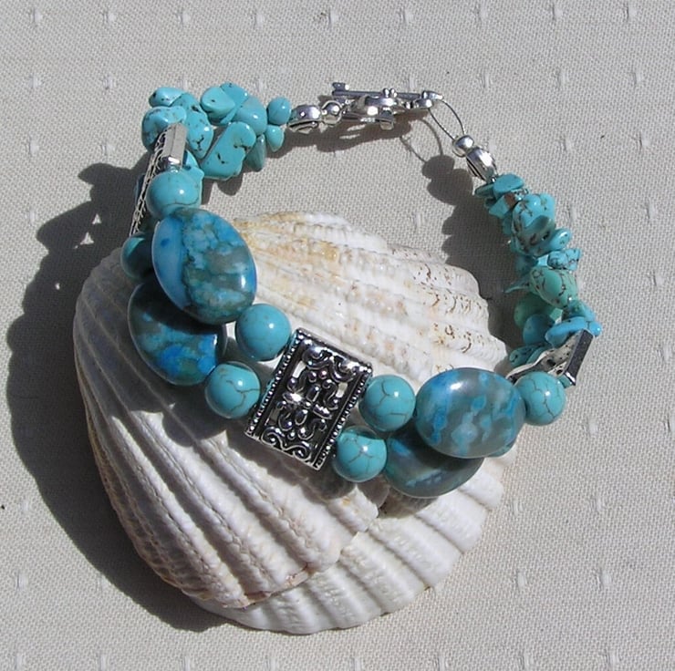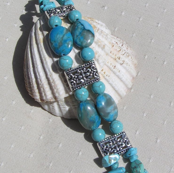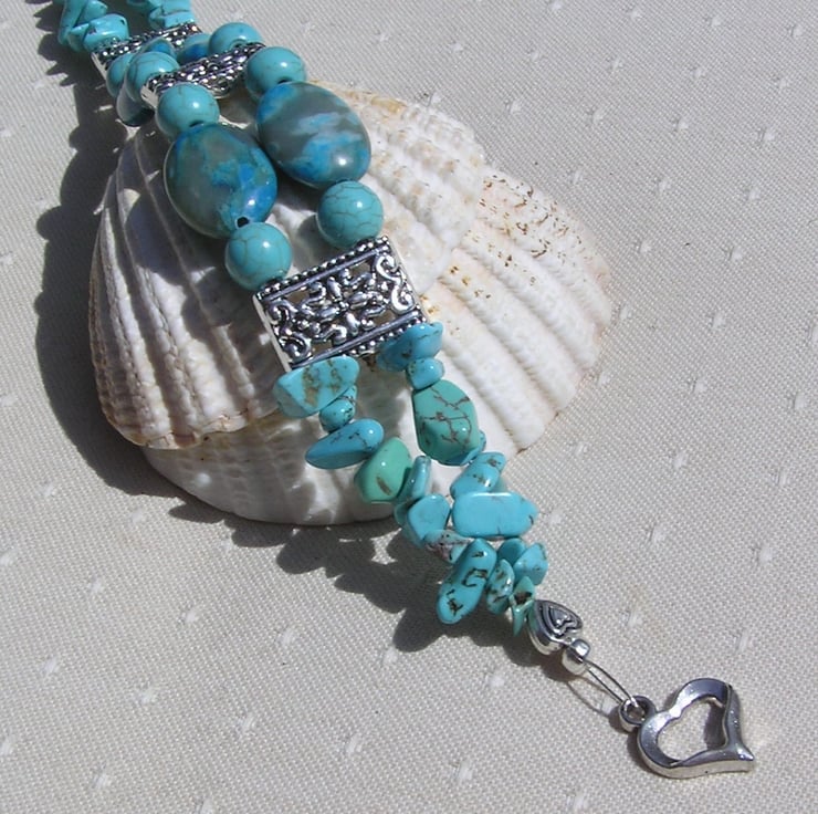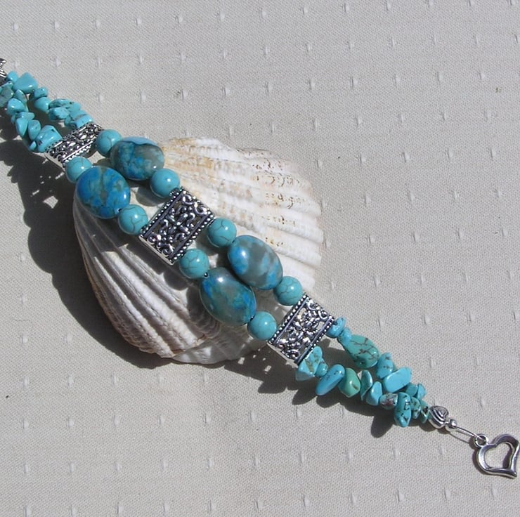 This Stunning Bracelet is made from is made from Oval shaped Blue Crazy Lace Agate Beads with Turquoise Magnesite round Beads teamed Turquoise Magnesite Gem Chips… each section separated by an ornately decorated Tibetan Silver Bar Spacer with a tiny Silver Heart at each end - a Beautiful combination that will look stunning either worn casually or with something more Elegant for a Special Evening out